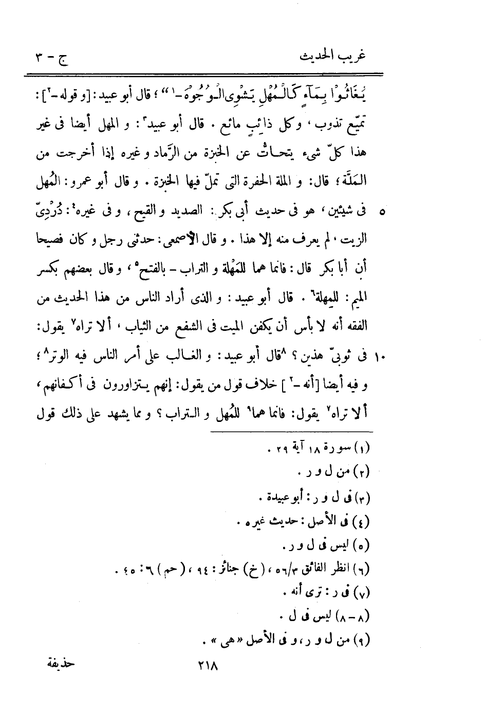 قَالَ أَبُو عبيد: [وَقَوله -] : تميّع تذوب وكل ذائِبٍ مَائِع. قَالَ أَبُو عبيد: والمهل أَيْضا فِي غير هَذَا كلّ شَيْء يتحاتُّ عَن الخبزة من الرَّماد وَغَيره إِذا أخرجت من المَلَّة قَالَ: وَالْملَّة الحفرة الَّتِي تملّ فِيهَا الخبزة. وَقَالَ أَبُو عَمْرو: المُهل فِي شَيْئَيْنِ هُوَ فِي حَدِيث أبي بكر: الصديد والقيح وَفِي غَيره: دُرْدِيّ الزَّيْت لم يعرف مِنْهُ إِلَّا هَذَا. وَقَالَ الْأَصْمَعِي: حَدثنِي رجل وَكَانَ فصيحا أَن أَبَا بكر قَالَ: فَإِنَّمَا هما للمَهْلة وَالتُّرَاب بِالْفَتْح وَقَالَ بَعضهم بِكَسْر الْمِيم: للمِهلة. قَالَ أَبُو عبيد: وَالَّذِي أَرَادَ النَّاس من هَذَا الحَدِيث من الْفِقْه أَنه لَا بَأْس أَن يُكفن الْمَيِّت فِي الشفع من الثِّيَاب أَلا ترَاهُ يَقُول فِي ثوبيّ هذَيْن قَالَ أَبُو عبيد: وَالْغَالِب على أَمر النَّاس فِيهِ الْوتر وَفِيه أَيْضا [أَنه -] خلاف قَول من يَقُول: إِنَّهُم يتزاورون فِي أكفانهم أَلا ترَاهُ يَقُول: فَإِنَّمَا هما للمُهل وَالتُّرَاب وَمِمَّا يشْهد على ذَلِك قَول