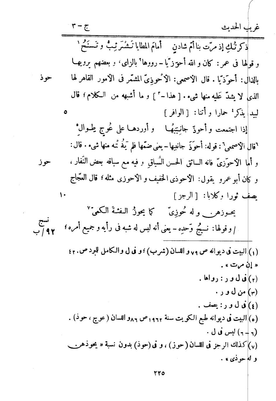 قَالَ الْأَصْمَعِي: قَوْله: أحوَذَ جانبيها يَعْنِي ضمّها فَلم يّفُتْه مِنْهَا شَيْء. قَالَ: وَأما الأحوَزي فَإِنَّهُ السَّائِق الْحسن السِّياقِ وَفِيه مَعَ سِيَاقه بعض النَفار وَكَانَ أَبُو عَمْرو يَقُول: الأحوذي الْخَفِيف والأحوزي مثله قَالَ العجّاج يصف ثورا وكلابا: [الرجز]