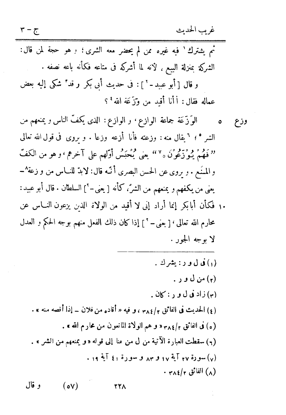 وزع وَقَالَ [أَبُو عبيد -] : فِي حَدِيث أبي بكر وَقد شكى إِلَيْهِ بعض عماله فَقَالَ: أأناأقيد من وَزَعَة الله الوَزَعَة جمَاعَة الْوَازِع والوازع: الَّذِي يكفّ النَّاس ويمنعهم من الشَّرّ يُقَال مِنْهُ: وزعته فَأَنا أزعه وزعا. ويروى فِي قَول الله تَعَالَى {فَهُمْ يُوزَعُوْن} يَعْنِي يُحْبَسُ أوّلهم على آخِرهم وَهُوَ من الكفّ والمنْع. ويروى عَن الْحسن الْبَصْرِيّ أنّه قَالَ: لَا بدّ للنَّاس من وزعة يَعْنِي من يَكفهمْ ويمنعهم من الشرّ كَأَنَّهُ [يعْنى -] السُّلْطَان. قَالَ أَبُو عبيد: فَكَأَن أَبَا بكر إِنَّمَا أَرَادَ إِنِّي لَا أقيد من الْوُلَاة الَّذين يزعون النَّاس عَن محارم الله تَعَالَى [يَعْنِي -] إِذا كَانَ ذَلِك الْفِعْل مِنْهُم بِوَجْه الحكم وَالْعدْل لَا بِوَجْه الْجور.
