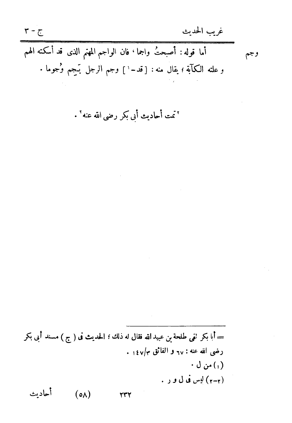 أما قَوْله أصبحتُ واجما فَإِن الواجم المهتم الَّذِي قد أسكته الْهم وعلته الكآبة يُقَال مِنْهُ: [قد -] وجم الرجل يَجِم وُجوما. تمت أَحَادِيث أبي بكر رَضِي الله عَنهُ.