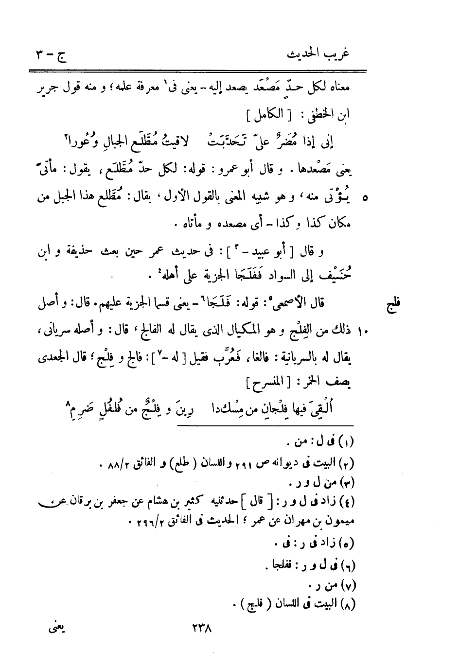 فلج وَقَالَ [أَبُو عبيد -] : فِي حَدِيث عمر حِين بعث حُذَيْفَة وَابْن حُنَيْف إِلَى السوَاد فَفَلَجَا الْجِزْيَة على أَهله. قَالَ الْأَصْمَعِي: قَوْله: فَلَجَا يَعْنِي قسما الْجِزْيَة عَلَيْهِم. قَالَ: وأصل ذَلِك من الفِلْج وَهُوَ الْمِكْيَال الَّذِي يُقَال لَهُ الفالج قَالَ: وَأَصله سرياني يُقَال لَهُ بالسُّرْيَانيَّة: فالغا فَعرِّب فَقيل [لَهُ -] : فالج وفِلْج قَالَ الْجَعْدِي يصف الْخمر: [المنسرح]
