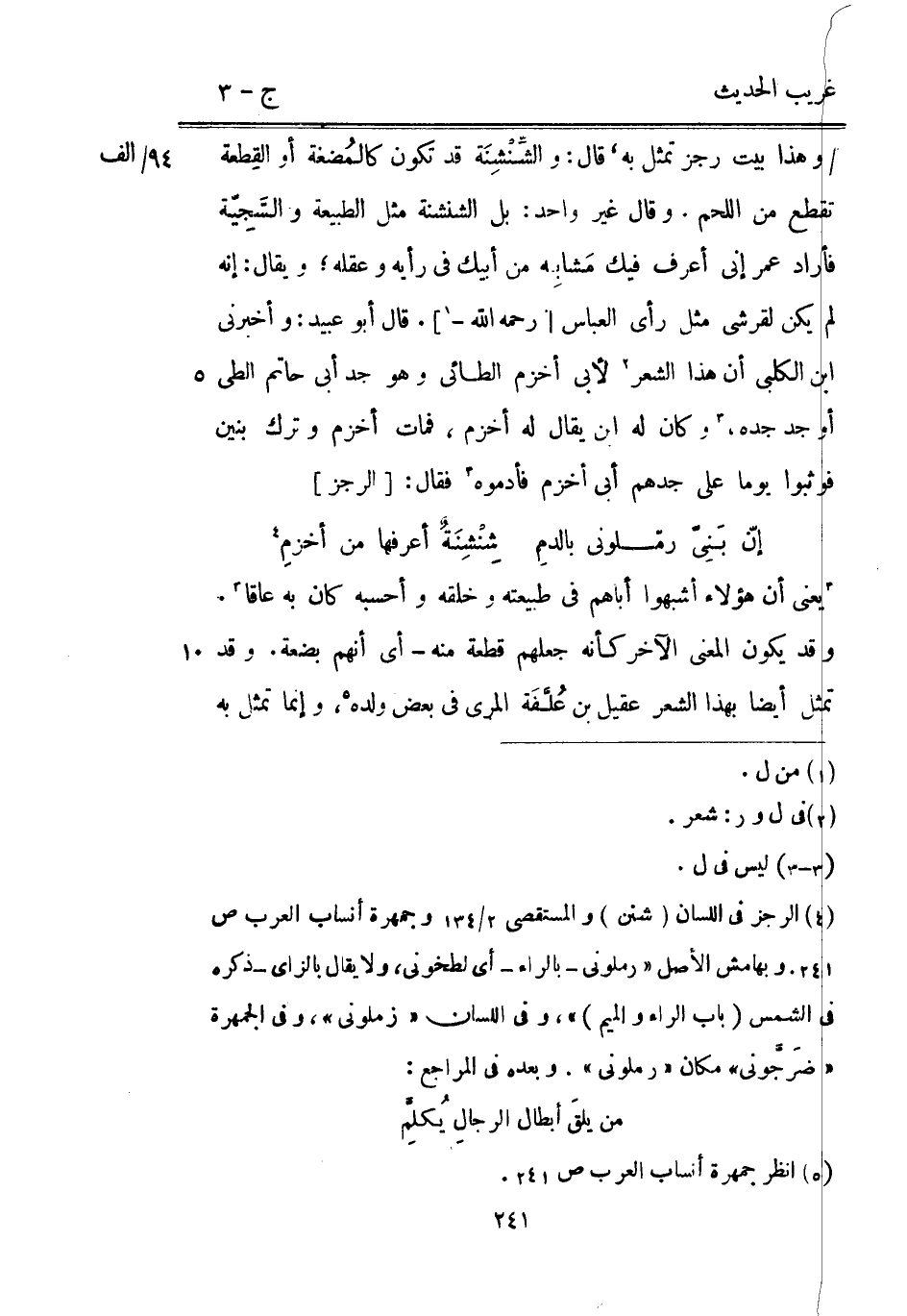/ هَذَا بَيت رجز تمثل بِهِ قَالَ: والشِّنْشِنَة قد تكون كالمُضغة أَو الْقطعَة 94 / الف تقطع من اللَّحْم. وَقَالَ غير وَاحِد: بل الشنشنة مثل الطبيعة والسَّجِيّة فَأَرَادَ عمر إِنِّي أعرف فِيك مَشابِه من أَبِيك فِي رَأْيه وعقله وَيُقَال: إِنَّه لم يكن لقرشي مثل رَأْي الْعَبَّاس [رَحمَه الله -] . قَالَ أَبُو عبيد: وَأَخْبرنِي ابْن الْكَلْبِيّ أَن هَذَا الشّعْر لأبي أخزم الطَّائِي وَهُوَ جد أبي حَاتِم الطي أَو جد جده وَكَانَ لَهُ ابْن يُقَال لَهُ أخزم فَمَاتَ أخزم وَترك بَنِينَ فَوَثَبُوا يَوْمًا على جدهم أبي أخزم فأدموه فَقَالَ: [الرجز]