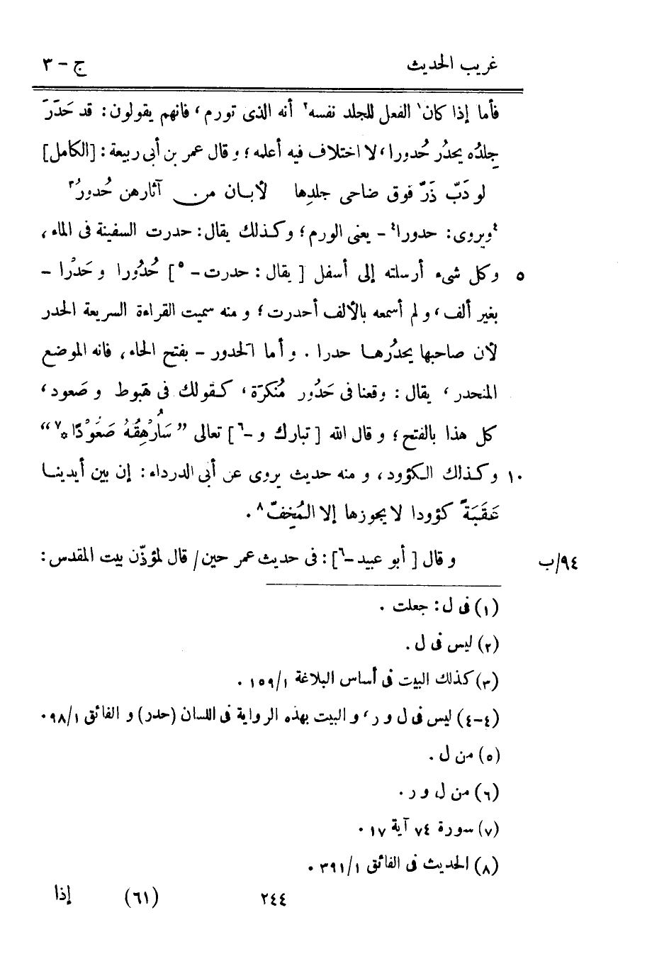 ويروى: حدورا يَعْنِي الورم وَكَذَلِكَ يُقَال: حدرت السَّفِينَة فِي المَاء وكل شَيْء أَرْسلتهُ إِلَى أَسْفَل [يُقَال: حدرت -] حُدُورا وحَدْرا بِغَيْر ألف وَلم أسمعهُ بِالْألف أحدرت وَمِنْه سميت الْقِرَاءَة السريعة الحدر لِأَن صَاحبهَا يحدُرها حدرا. وَأما الحَدور بِفَتْح الْحَاء فَإِنَّهُ الْموضع المنحدر يُقَال: وقعنا فِي حَدُور مُنكرَة كَقَوْلِك فِي هَبوط وصَعود كل هَذَا بِالْفَتْح وَقَالَ الله [تبَارك و -] تَعَالَى {سَأُرْهِقُهُ صَعُوْداً} وَكَذَلِكَ الكؤود وَمِنْه حَدِيث يرْوى عَن أبي الدَّرْدَاء: إِن بَين أَيْدِينَا عَقَبَةً كؤودا لَا يجوزها إِلَّا المُخِفّ. 94 / ب وَقَالَ [أَبُو عبيد -] : فِي حَدِيث عمر حِين / قَالَ لمؤذّن بَيت الْمُقَدّس: