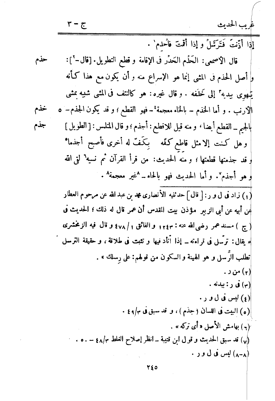 إِذا أذّنتَ فَتَرَسّلْ وَإِذا أقمتَ فاْحذم. قَالَ الْأَصْمَعِي: الحَذم الحَدْر فِي الْإِقَامَة وَقطع التَّطْوِيل. [قَالَ -] : وأصل الحذم فِي الْمَشْي إِنَّمَا هُوَ الْإِسْرَاع مِنْهُ وَأَن يكون مَعَ هَذَا كَأَنَّهُ يَهوي بيدَيْهِ إِلَى خَلْفه. وَقَالَ غَيره: هُوَ كالنتف فِي الْمَشْي شَبيه بمشي الأرنب. وَأما الخذم بِالْخَاءِ مُعْجمَة فَهُوَ الْقطع وَقد يكون الجذم بِالْجِيم الْقطع أَيْضا وَمِنْه قيل للاقطع: أَجْذم وَقَالَ المتلمس: [الطَّوِيل]
