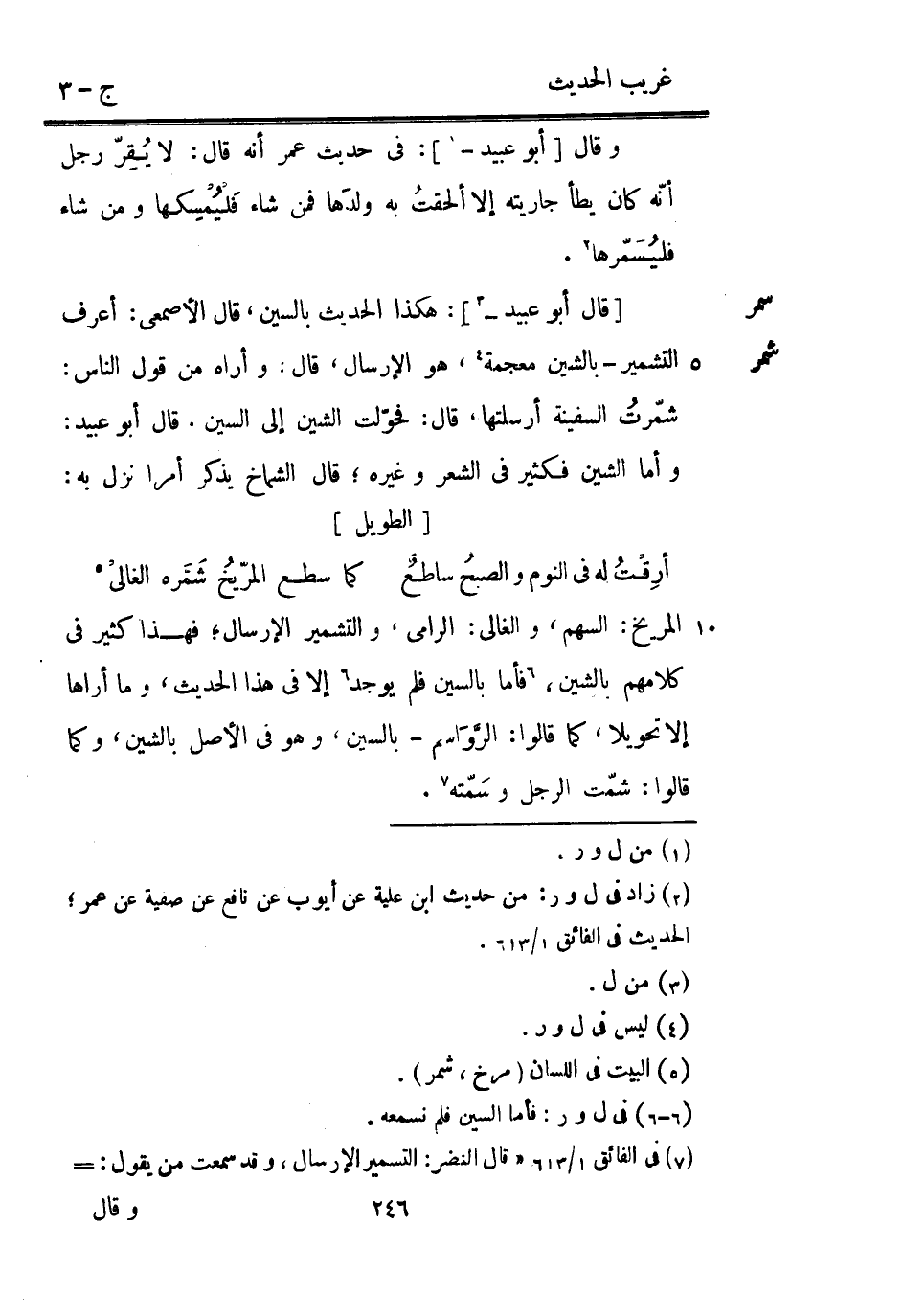 سمر شمر وَقَالَ [أَبُو عبيد -] : فِي حَدِيث عمر أَنه قَالَ: لَا يُقِرّ رجل أنّه كَانَ يطَأ جَارِيَته إِلَّا ألحقتُ بِهِ ولدَها فَمن شَاءَ فَلْيُمْسِكها وَمن شَاءَ فليُسَمّرها. [قَالَ أَبُو عبيد -] : هَكَذَا الحَدِيث بِالسِّين قَالَ الْأَصْمَعِي: أعرف التشمير بالشين مُعْجمَة هُوَ الْإِرْسَال قَالَ: وَأرَاهُ من قَول النَّاس: شمّرتُ السَّفِينَة أرسلتها قَالَ: فحوّلت الشين إِلَى السِّين. قَالَ أَبُو عبيد: وَأما الشين فكثير فِي الشّعْر وَغَيره قَالَ الشماخ يذكر أمرا نزل بِهِ: