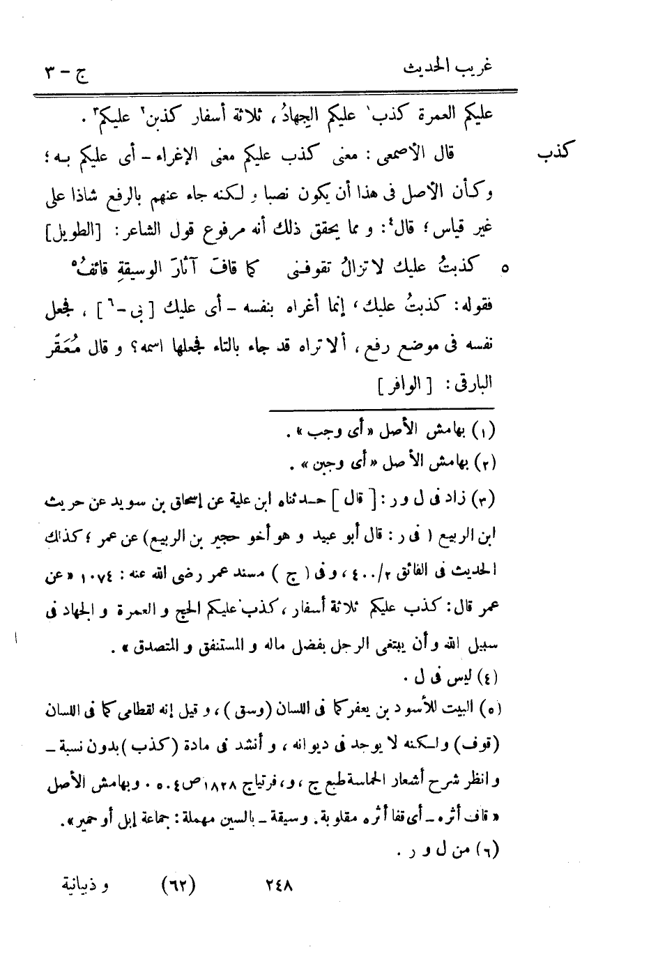 عَلَيْكُم الْعمرَة كذب عَلَيْكُم الجِهادُ ثَلَاثَة أسفار كذبن عَلَيْكُم. قَالَ الْأَصْمَعِي: معنى كذب عَلَيْكُم معنى الإغراء أَي عَلَيْكُم بِهِ وَكَأن الأَصْل فِي هَذَا أَن يكون نصبا وَلكنه جَاءَ عَنْهُم بِالرَّفْع شاذا على غير قِيَاس قَالَ: وَمِمَّا يُحَقّق ذَلِك أَنه مَرْفُوع قَول الشَّاعِر: [الطَّوِيل]