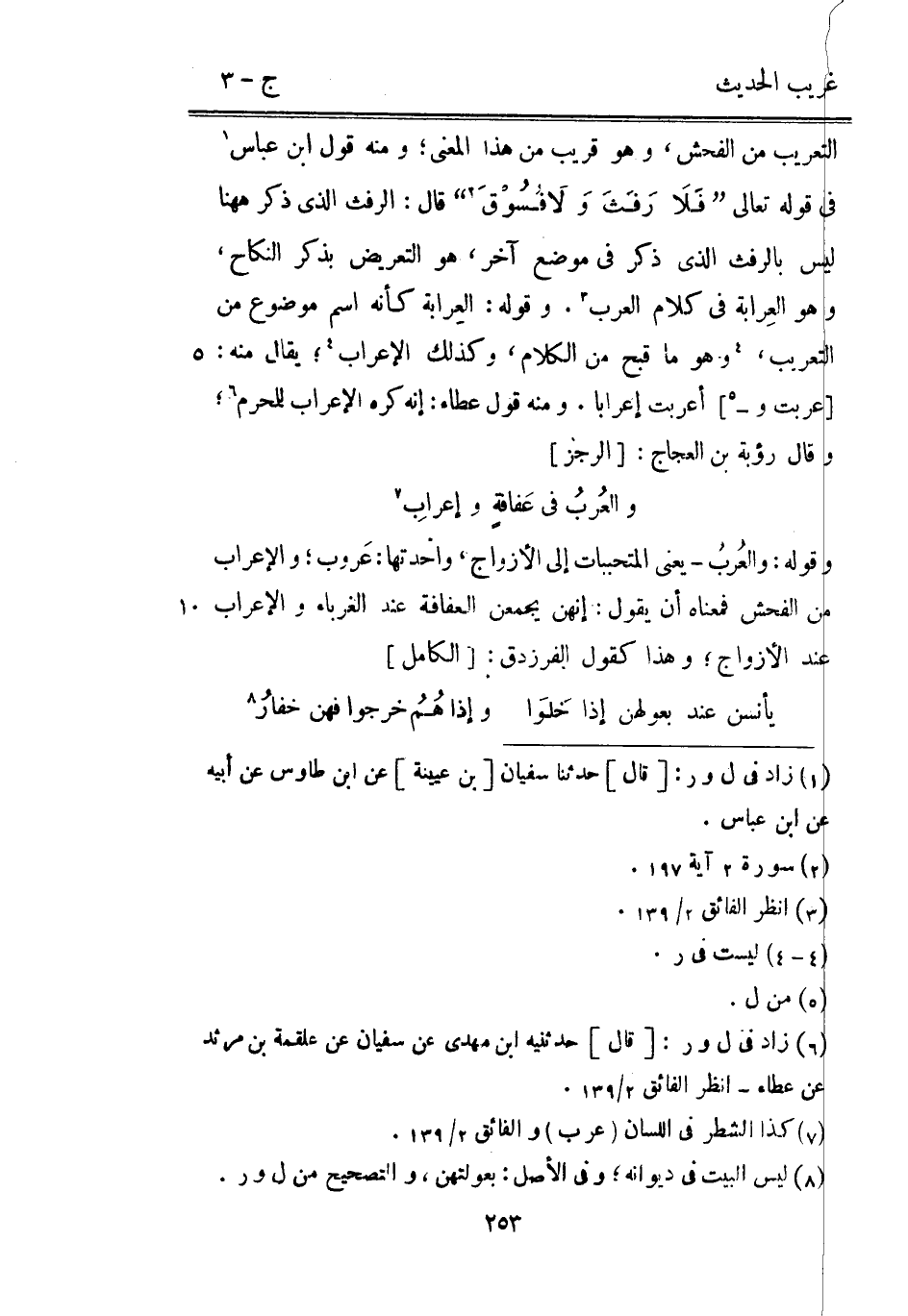 التَّعْرِيض من الْفُحْش وَهُوَ قريب من هَذَا الْمَعْنى وَمِنْه قَول ابْن عَبَّاس فِي قَوْله تَعَالَى {فَلاَ رَفَثَ وَلاَ فُسُوْقَ} قَالَ: الرَّفَث الَّذِي ذكر هَهُنَا لَيْسَ بالرفث الَّذِي ذكر فِي مَوضِع آخر هُوَ التحريض بِذكر النِّكَاح وَهُوَ العِرابة فِي كَلَام الْعَرَب. وَقَوله: العِرابة كَأَنَّهُ اسْم مَوْضُوع من التعريب وَهُوَ مَا قبح من الْكَلَام وَكَذَلِكَ الْإِعْرَاب يُقَال مِنْهُ: [عربت و -] أعربت إعرابا. وَمِنْه قَول عَطاء: إِنَّه كره الْإِعْرَاب للْمحرمِ وَقَالَ رؤبة بن العجاج: [الرجز]
