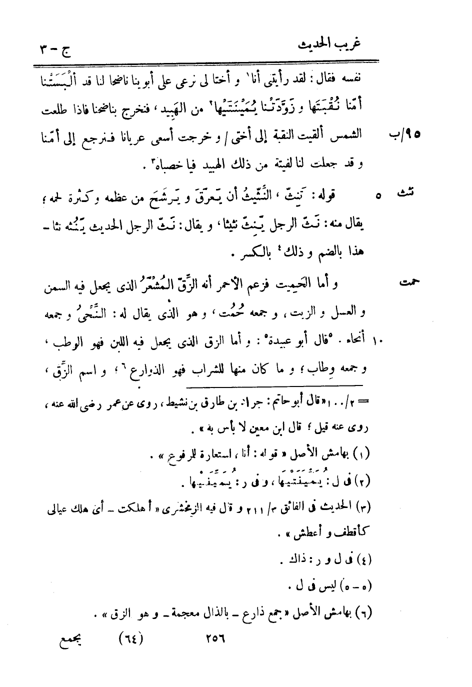 نَفسه فَقَالَ: لقد رَأَيْتنِي أَنا وأختا لي نرعى على أبوينا ناضحا لنا قد ألْبَسَتْنا أمّنا نُقْبَتَها وزَوَّدَتْنا يُمَيْنَتَيْها من الهَبِيد فنخرج بناضحنا فَإِذا طلعت 95 / ب الشَّمْس ألقيت النقبة إِلَى أُخْتِي / وَخرجت أسعى عُريَانا فنرجع إِلَى أمّنا وَقد جعلت لنا لفيتة من ذَلِك الهبيد فيا خصباه. قَوْله: تَنِثّ النِّثّيثُ أَن يعرَقَ ويَرشَحَ من عظمه وَكَثْرَة لَحْمه يُقَال مِنْهُ: نَثّ الرجل يَنِثّ نثيثا وَيُقَال نَثّ الرجل الحَدِيث يَنُثه نَثَا هَذَا بِالضَّمِّ وَذَلِكَ بِالْكَسْرِ. وَأما الحَمِيت فَزعم الْأَحْمَر أَنه الزِّقّ المُشْعَرُ الَّذِي يَجْعَل فِيهِ السّمن وَالْعَسَل وَالزَّيْت وَجمعه حُمُت وَهُوَ الَّذِي يُقَال لَهُ: النِّحْيُ وَجمعه أنحاء. قَالَ أَبُو عُبَيْدَة: وَأما الزق الَّذِي يَجْعَل فِيهِ اللَّبن فَهُوَ الوطب وَجمعه وِطاب وَمَا كَانَ مِنْهَا للشراب فَهُوَ الذوارع وَاسم الزَّق