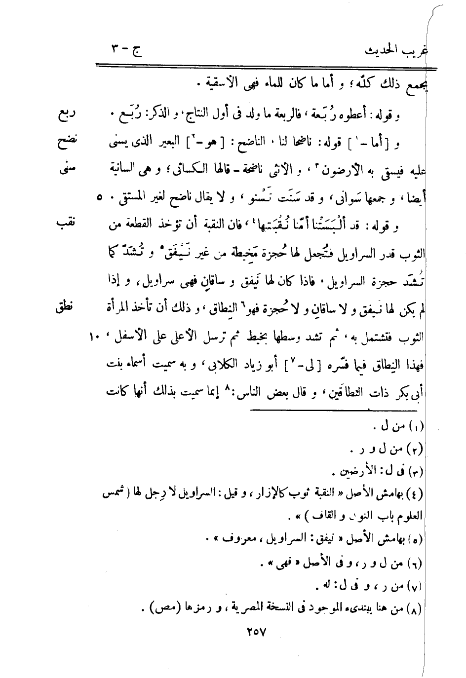يجمع ذَلِك كلّه وَأما مَا كَانَ للْمَاء فَهِيَ الأسقية. وَقَوله: أَعْطوهُ رُبَعة فالربعة مَا ولد فِي أول النِّتَاج وَالذكر: رُبَع. و [أما -] قَوْله: ناضحا لنا الناضح: [هُوَ -] الْبَعِير الَّذِي يسنى عَلَيْهِ فيسقى بِهِ الأرضون وَالْأُنْثَى ناضحة قَالَهَا الْكسَائي وَهِي السانية أَيْضا وَجَمعهَا سَواني وَقد سَنَت تَسْنو وَلَا يُقَال نَاضِح لغير المستقي. وَقَوله: قد ألْبَسَتْنا أمّنا نُقْبَتها فَإِن النقبة أَن تُؤْخَذ الْقطعَة من الثَّوْب قدر السَّرَاوِيل فتُجعل لَهَا حُجزة مَخِيطة من غير نَيْفَق وتُشَدّ كَمَا تُشَد حجزة السَّرَاوِيل فَإِذا كَانَ لَهَا نَيفق وساقانِ فَهِيَ سَرَاوِيل وَإِذا لم يكن لَهَا نَيفق وَلَا ساقانِ وَلَا حُجزة فَهُوَ النِطاق وَذَلِكَ أَن تَأْخُذ الْمَرْأَة الثَّوْب فتشتمل بِهِ ثمَّ تشد وَسطهَا بخيط ثمَّ ترسل الْأَعْلَى على الْأَسْفَل فَهَذَا النِطاق فِيمَا فسّره [لي -] أَبُو زِيَاد الْكلابِي وَبِه سميت أَسمَاء بنت أبي بكر ذَات النطاقَين وَقَالَ بعض النَّاس: إِنَّمَا سميت بذلك أَنَّهَا كَانَت