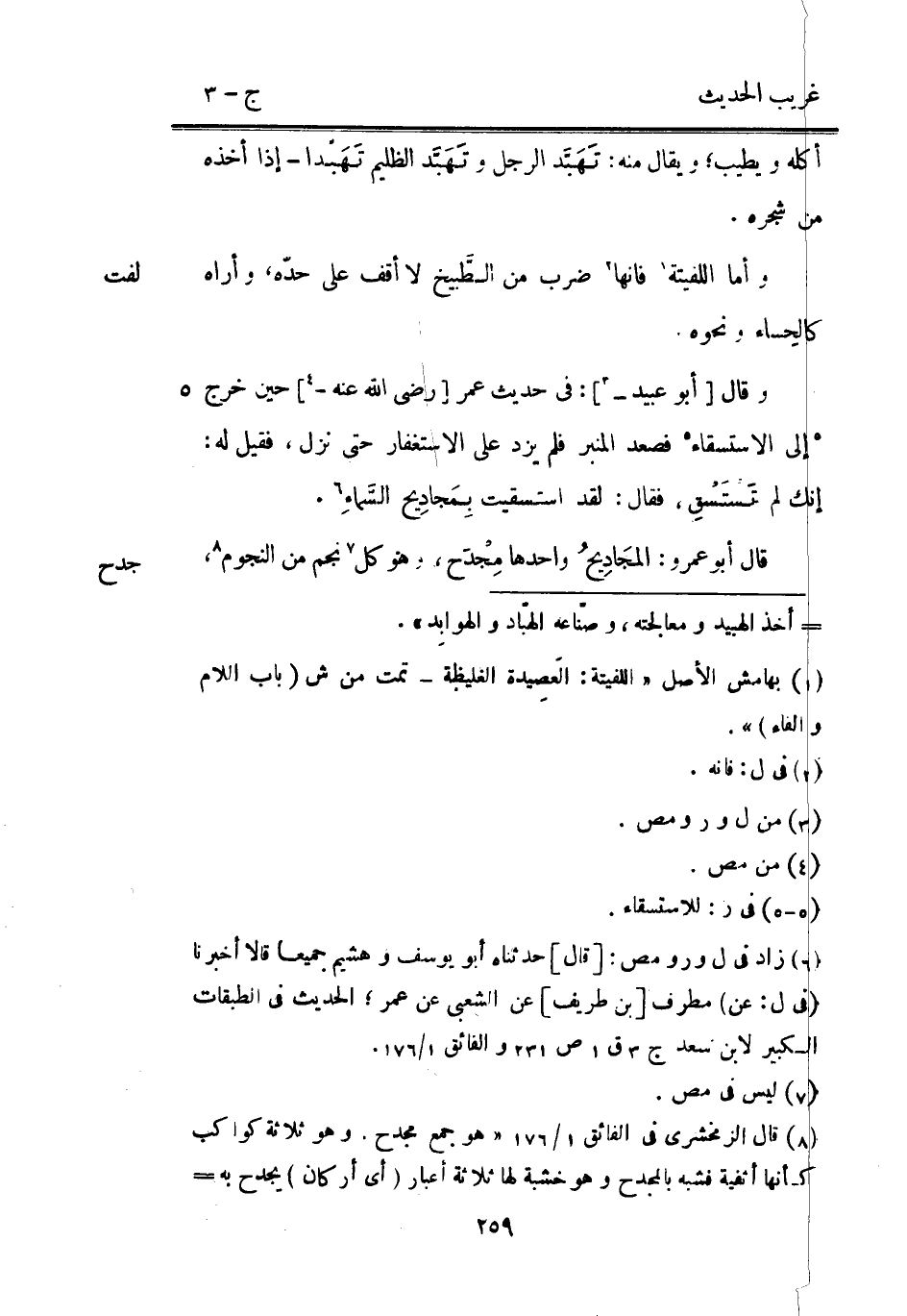 جدح / وَقَالَ [أَبُو عبيد -] : فِي حَدِيث عمر [رَضِي الله عَنهُ -] حِين خرج إِلَى الاسْتِسْقَاء فَصَعدَ الْمِنْبَر فَلم يزدْ على الاسْتِغْفَار حَتَّى نزل فَقيل لَهُ: إِنَّك لم تَسْتَسُقِ فَقَالَ: لقد اسْتَسْقَيْت بِمَجادِيح السَّماءِ. قَالَ أَبُو عَمْرو: المَجادِيحُ وَاحِدهَا مِجْدَح وَهُوَ كل نجم من النُّجُوم