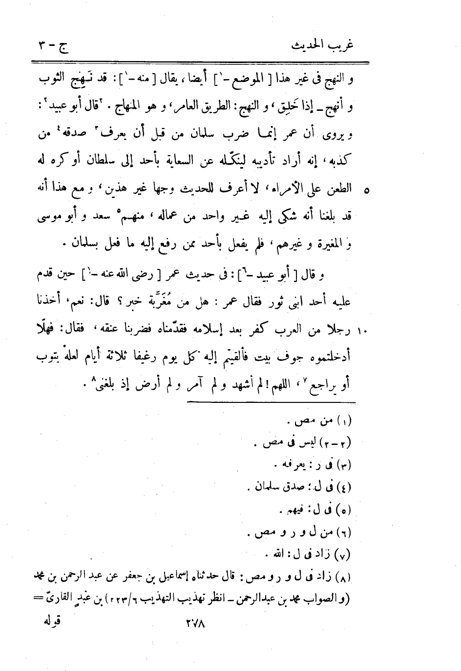 والنهج فِي غير هَذَا [الْموضع -] أَيْضا يُقَال [مِنْهُ -] : قد نَهِج الثَّوْب وأنهج إِذا خَلِق والنهج: الطَّرِيق العامر وَهُوَ الْمِنْهَاج. قَالَ أَبُو عبيد: ويروى أَن عمر إِنَّمَا ضرب سلمَان من قبل أَن يعرف صدقه من كذبه إِنَّه أَرَادَ تأديبه لينكّله عَن السّعَايَة بِأحد إِلَى سُلْطَان أَو كره لَهُ الطعْن على الْأُمَرَاء لَا أعرف للْحَدِيث وَجها غير هذَيْن وَمَعَ هَذَا أَنه قد بلغنَا أَنه شكى إِلَيْهِ غير وَاحِد من عماله مِنْهُم سعد وَأَبُو مُوسَى والمغيرة وَغَيرهم فَلم يفعل بِأحد مِمَّن رفع إِلَيْهِ مَا فعل بسلمان.