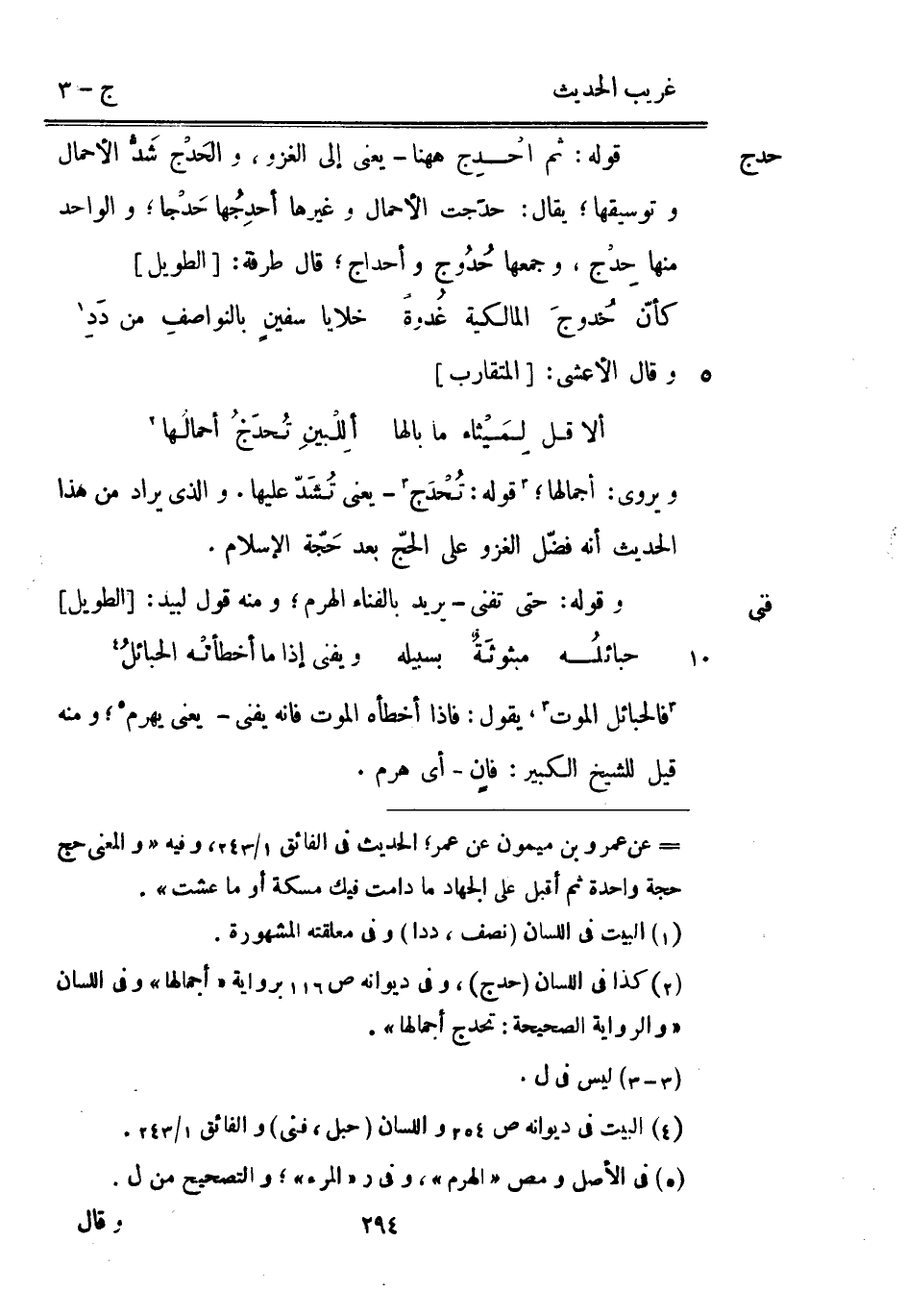 ويروى: أجمالها قَوْله: تُحْدَج يَعْنِي تُشَدّ عَلَيْهَا. وَالَّذِي يُرَاد من هَذَا الحَدِيث أَنه فضّل الْغَزْو على الحجّ بعد حَجّة الْإِسْلَام. وَقَوله: حَتَّى تفنى يُرِيد بالفناء الْهَرم وَمِنْه قَول لبيد: [الطَّوِيل]