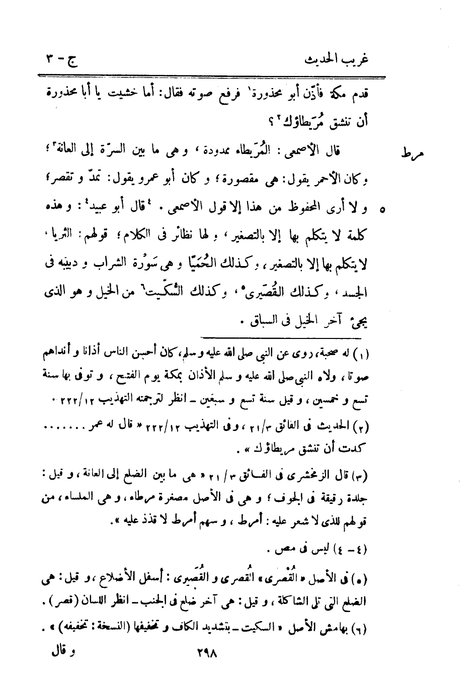 قدم مَكَّة فأذّن أَبُو مَحْذُورَة فَرفع صَوته فَقَالَ: أما خشيت يَا أَبَا مَحْذُورَة أَن تَنْشَق مُرَيطاؤك قَالَ الْأَصْمَعِي: المُرَيطاء ممدودة وَهِي مَا بَين السرّة إِلَى الْعَانَة وَكَانَ الْأَحْمَر يَقُول: هِيَ مَقْصُورَة وَكَانَ أَبُو عَمْرو يَقُول: تمدّ وتقصر وَلَا أرى الْمَحْفُوظ من هَذَا إِلَّا قَول الْأَصْمَعِي. قَالَ أَبُو عبيد: وَهَذِه كلمة لَا يتَكَلَّم بهَا إِلَّا بِالتَّصْغِيرِ وَلها نَظَائِر فِي الْكَلَام قَوْلهم: الثريا لَا يتَكَلَّم بهَا إِلَّا بِالتَّصْغِيرِ وَكَذَلِكَ الحُمَيّا وَهِي سَوْرة الشَّرَاب ودبيبه فِي الْجَسَد وَكَذَلِكَ القُصَيري وَكَذَلِكَ السُّكّيت من الْخَيل وَهُوَ الَّذِي يَجِيء آخر الْخَيل فِي السباق.