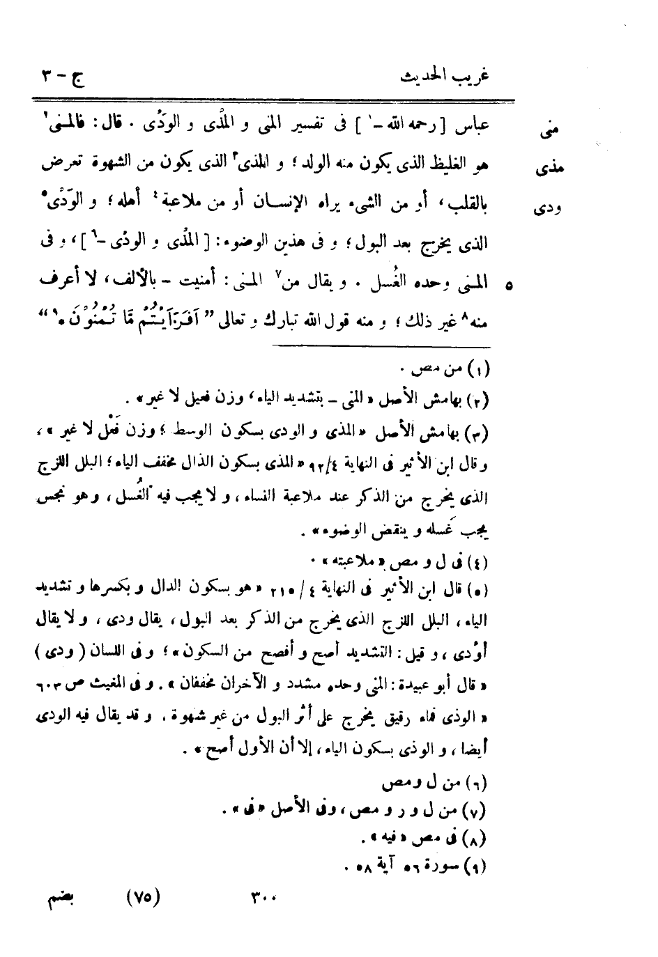 عَبَّاس [رَحمَه الله -] فِي تَفْسِير الْمَنِيّ والمذْي والوَدُي. قَالَ: فالمني هُوَ الغليظ الَّذِي يكون مِنْهُ الْوَلَد والمذي الَّذِي يكون من الشَّهْوَة تعرض بِالْقَلْبِ أَو من الشَّيْء يرَاهُ الْإِنْسَان أَو من ملاعبة أَهله والوَدْي الَّذِي يخرج بعد الْبَوْل وَفِي هذَيْن الْوضُوء: [المذْى والودُى -] وَفِي الْمَنِيّ وَحده الغُسل. وَيُقَال من الْمَنِيّ: أمنيت بِالْألف لَا أعرف مِنْهُ غير ذَلِك وَمِنْه قَول الله تبَارك وَتَعَالَى {أَفَرَأَيْتُم مَا تمنون}