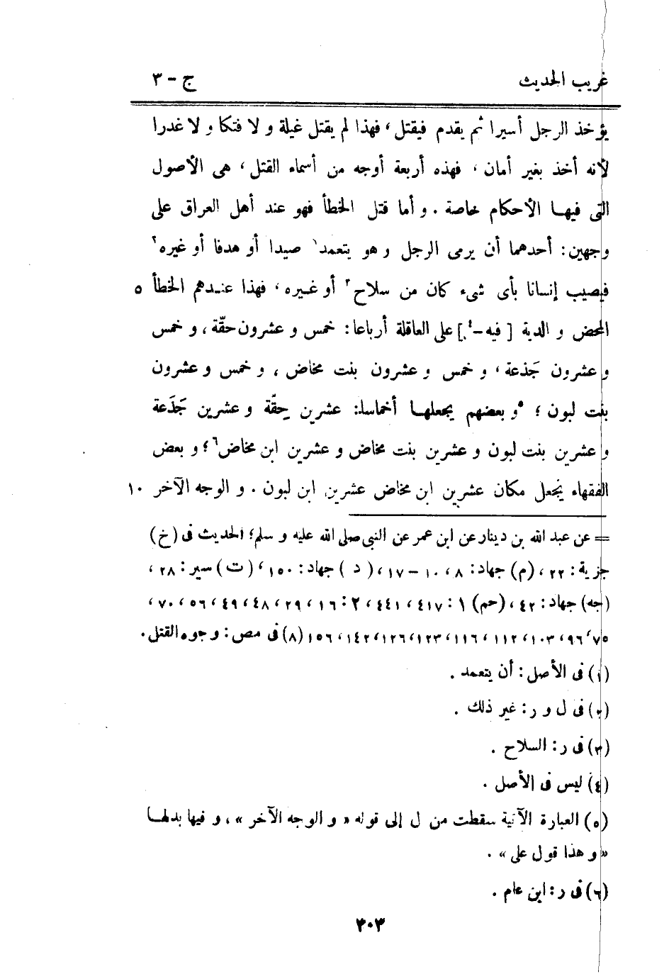 يُؤْخَذ الرجل أَسِيرًا ثمَّ يقدم فَيقْتل فَهَذَا لم يقتل غيلَة وَلَا فتكا وَلَا غدرا لِأَنَّهُ أَخذ بِغَيْر أَمَان فَهَذِهِ أَرْبَعَة أوجه من أَسمَاء الْقَتْل هِيَ الْأُصُول الَّتِي فِيهَا الْأَحْكَام خَاصَّة. وَأما قتل الْخَطَأ فَهُوَ عِنْد أهل الْعرَاق على وَجْهَيْن: أَحدهمَا أَن يَرْمِي الرجل وَهُوَ يتَعَمَّد صيدا أَو هدفا أَو غَيره فَيُصِيب إنْسَانا بِأَيّ شَيْء كَانَ من سلَاح أَو غَيره فَهَذَا عِنْدهم الْخَطَأ الْمَحْض وَالدية [فِيهِ -] على الْعَاقِلَة أَربَاعًا: خمس وَعِشْرُونَ حقّة وَخمْس وَعِشْرُونَ جَذعة وَخمْس وَعِشْرُونَ بنت مَخَاض وَخمْس وَعِشْرُونَ بنت لبون وَبَعْضهمْ يَجْعَلهَا أَخْمَاس: عشْرين حِقّة وَعشْرين جَذَعة وَعشْرين بنت لبون وَعشْرين بنت مَخَاض وَعشْرين ابْن مَخَاض وَبَعض الْفُقَهَاء يَجْعَل مَكَان عشْرين ابْن مَخَاض عشْرين ابْن لبون. وَالْوَجْه الآخر