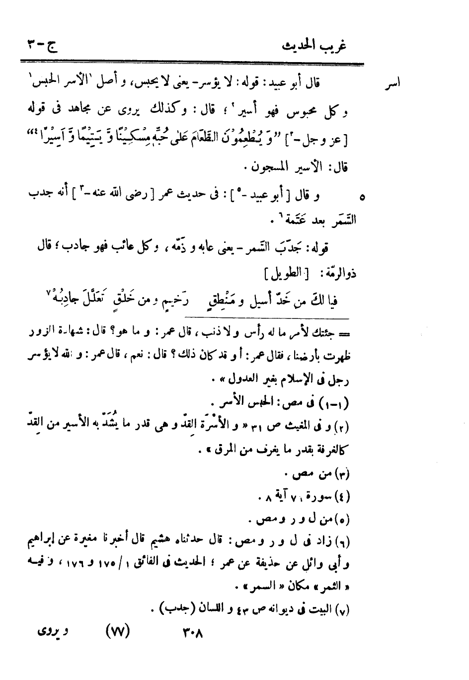 قَالَ أَبُو عبيد: قَوْله: لَا يؤسر يَعْنِي لَا يحبس وأصل الْأسر الْحَبْس وكل مَحْبُوس فَهُوَ أَسِير قَالَ: وَكَذَلِكَ يرْوى عَن مُجَاهِد فِي قَوْله [عز وَجل -] {وَيُطْعِمُوْنَ الطَّعَامَ عَلى حُبِّه مِسْكِيْناً وَّيَتِيْماً وَّأسِيْراً} قَالَ: الْأَسير المسجون. وَقَالَ [أَبُو عبيد -] : فِي حَدِيث عمر [رَضِي الله عَنهُ -] أَنه جَدب السَّمَر بعد عَتَمة. قَوْله: جَدَبَ السَّمر يَعْنِي عابه وذَمّه وكل عائب فَهُوَ جادب قَالَ ذُو الرمّة: [الطَّوِيل]