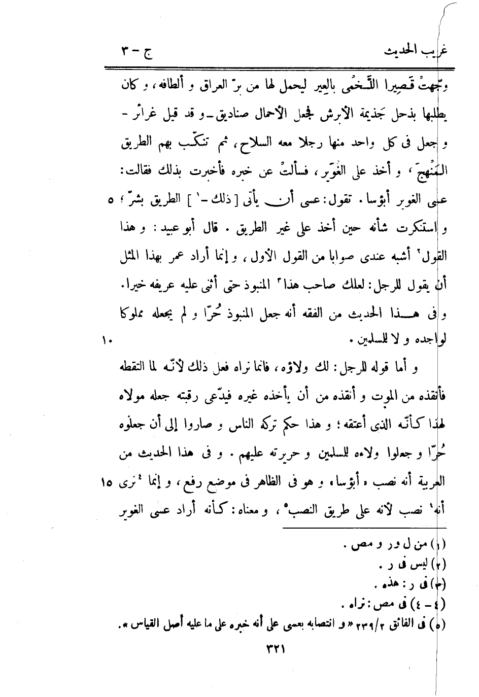 وجّهتْ قَصيرا اللَّخْمي بالعِير ليحمل لَهَا من برّ الْعرَاق وألطافه وَكَانَ يطْلبهَا بذحل جَذيمة الأبرش فَجعل الْأَحْمَال صناديق وَقد قيل غَرَائِر وَجعل فِي كل وَاحِد مِنْهَا رجلا مَعَه السِّلَاح ثمَّ تنكّب بهم الطَّرِيق المَنْهَجَ وَأخذ على الغوَير فسالتْ عَن خَبره فَأخْبرت بذلك فَقَالَت: عَسى الغوير أبؤسا. تَقول: عَسى أَن يَأْتِي [ذَلِك -] الطَّرِيق بشرّ واستنكرت شَأْنه حِين أَخذ على غير الطَّرِيق. قَالَ أَبُو عبيد: وَهَذَا القَوْل أشبه عِنْدِي صَوَابا من القَوْل الأول وَإِنَّمَا أَرَادَ عمر بِهَذَا الْمثل أَن يَقُول للرجل: لَعَلَّك صَاحب هَذَا المنبوذ حَتَّى أثنى عَلَيْهِ عريفه خيرا. وَفِي هَذَا الحَدِيث من الْفِقْه أَنه جعل المنبود حُرّا وَلم يَجعله مَمْلُوكا لواجده وَلَا للْمُسلمين. وَأما قَوْله للرجل: لَك وَلَاؤُه فَإِنَّمَا نرَاهُ فعل ذَلِك لأنّه لما التقطه فأنقذه من الْمَوْت وأنقذه من أَن يَأْخُذهُ غَيره فيدّعي رقبته جعله مَوْلَاهُ لهَذَا كأنّه الَّذِي أعْتقهُ وَهَذَا حكم تَركه النَّاس وصاروا إِلَى أَن جعلُوه حُرّا وَجعلُوا ولاءه للْمُسلمين وحريرته عَلَيْهِم. وَفِي هَذَا الحَدِيث من الْعَرَبيَّة أَنه نصب أبؤسا وَهُوَ فِي الظَّاهِر فِي مَوضِع رفع وَإِنَّمَا نرى أَنه نصب لِأَنَّهُ على طَرِيق النصب وَمَعْنَاهُ: كَأَنَّهُ أَرَادَ عَسى الغوير