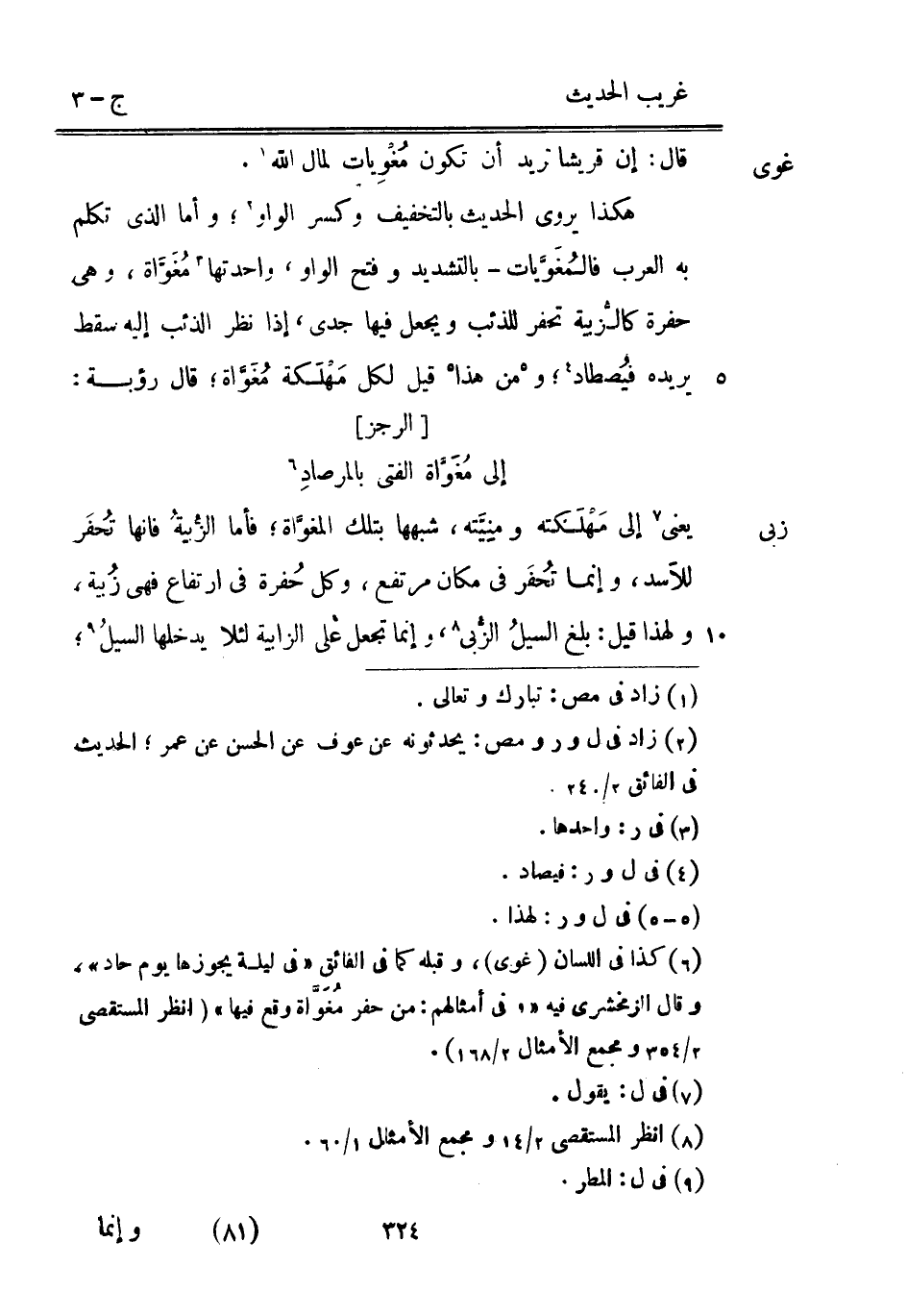 قَالَ: إِن قُريْشًا تُرِيدُ أَن تكون مُغْوِيات لمَال الله. هَكَذَا يرْوى الحَدِيث بِالتَّخْفِيفِ وَكسر الْوَاو وَأما الَّذِي تكلم بِهِ الْعَرَب فالمُغَوِّيات بِالتَّشْدِيدِ وَفتح الْوَاو واحدتها مُغَوَّاة وَهِي حُفْرَة كالزُّبية تحفر للذئب وَيجْعَل فِيهَا جدي إِذا نظر الذِّئْب إِلَيْهِ سقط يُريدهُ فيصطاد ومن هَذَا قيل لكل مَهْلَكة مُغَوَّاة قَالَ رؤبة: