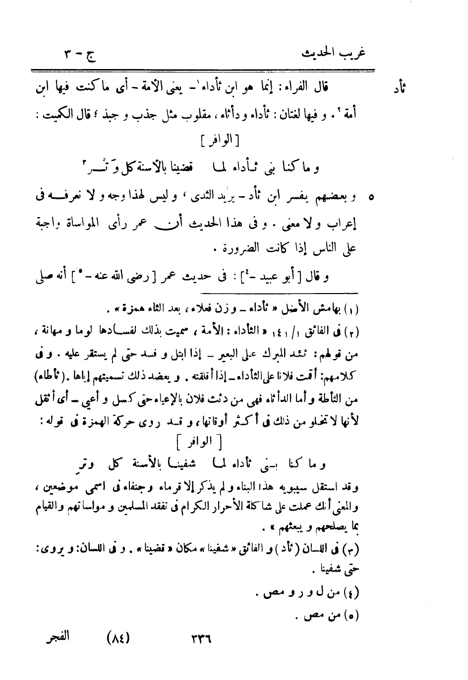 وَمَا كُنَّا بني ثأداء لما ... قضينا بالأسنة كل وَتْر ... وَبَعْضهمْ يُفَسر ابْن ثأد يُرِيد الثدي وَلَيْسَ لهَذَا وَجه وَلَا نعرفه فِي إِعْرَاب وَلَا معنى. وَفِي هَذَا الحَدِيث أَن عمر رأى الْمُوَاسَاة وَاجِبَة على النَّاس إِذا كَانَت الضَّرُورَة.