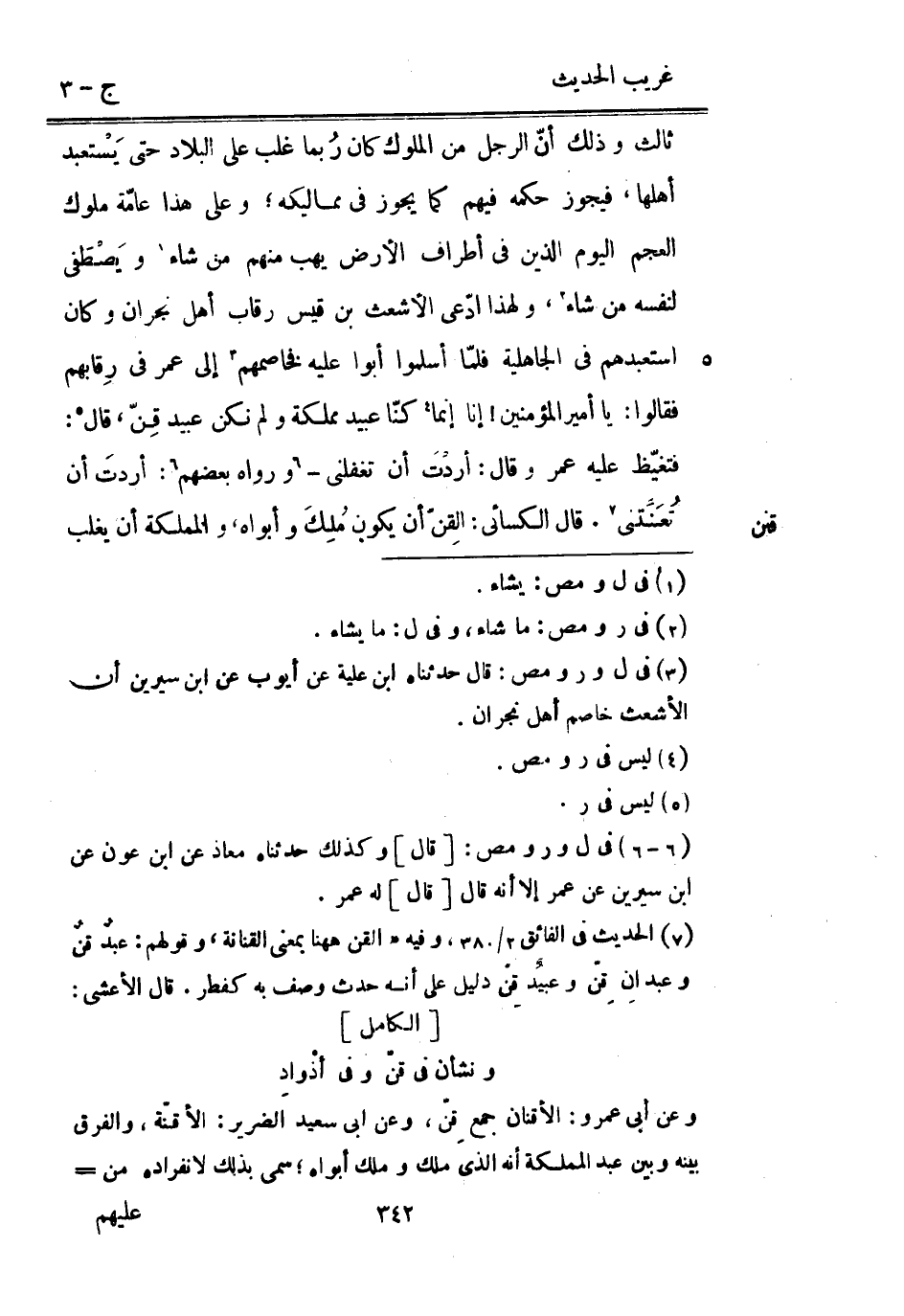 ثَالِث وَذَلِكَ أنّ الرجل من الْمُلُوك كَانَ رُبما غلب على الْبِلَاد حَتَّى يَسْتعبد أَهلهَا فَيجوز حكمه فيهم كَمَا يجوز فِي مماليكه وعَلى هَذَا عامّة مُلُوك الْعَجم الْيَوْم الَّذين فِي أَطْرَاف الأَرْض يهب مِنْهُم من شَاءَ ويَصْطَفي لنَفسِهِ من شَاءَ وَلِهَذَا ادّعى الْأَشْعَث بن قيس رِقَاب أهل نَجْرَان وَكَانَ استعبدهم فِي الْجَاهِلِيَّة فلمّا أَسْلمُوا أَبَوا عَلَيْهِ فخاصمهم إِلَى عمر فِي رِقابهم فَقَالُوا: يَا أَمِير الْمُؤمنِينَ إِنَّا إِنَّمَا كنّا عبيد مملكة وَلم نَكُنْ عبيد قِنّ قَالَ: فتغيّظ عَلَيْهِ عمر وَقَالَ: أردتَ أَن تغفلني وَرَوَاهُ بعضَهم: أردتَ أَن تُعَنِّتني. قَالَ الْكسَائي: القِنّ أَن يكون مُلِكَ وَأَبَوَاهُ والمملكة أَن يغلب