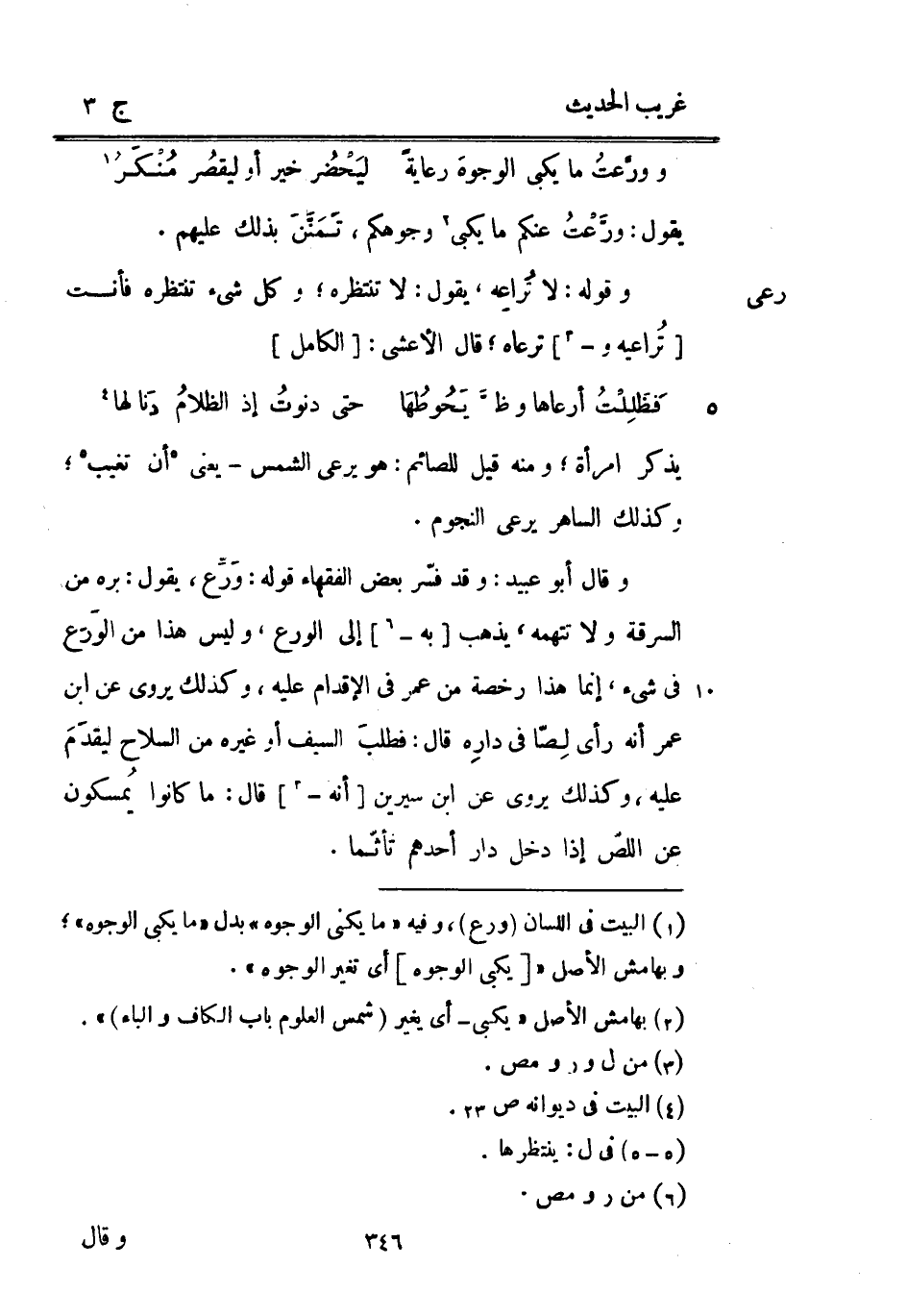 فَظَلِلْتُ أرعاها وظلَّ يَحُوطُهَا ... حَتَّى دنوتُ إِذْ الظلامُ دَنا لَهَا ... يذكر امْرَأَة وَمِنْه قيل للصَّائِم: هُوَ يرْعَى الشَّمْس يَعْنِي أَن تغيب وَكَذَلِكَ الساهر يرْعَى النُّجُوم. وَقَالَ أَبُو عبيد: وَقد فسّر بعض الْفُقَهَاء قَوْله: وَرِّع يَقُول: بره من السّرقَة وَلَا تتهمه يذهب [بِهِ -] إِلَى الْوَرع وَلَيْسَ هَذَا من الوَرَع فِي شَيْء إِنَّمَا هَذَا رخصَة من عمر فِي الْإِقْدَام عَلَيْهِ وَكَذَلِكَ يرْوى عَن ابْن عمر أَنه رأى لِصّا فِي دارِه قَالَ: فطلبَ السَّيْف أَو غَيره من السِّلَاح ليقدَمَ عَلَيْهِ وَكَذَلِكَ يرْوى عَن ابْن سِيرِين [أَنه -] قَالَ: مَا كَانُوا يُمسكون عَن اللصّ إِذا دخل دَار أحدهم تأثما.