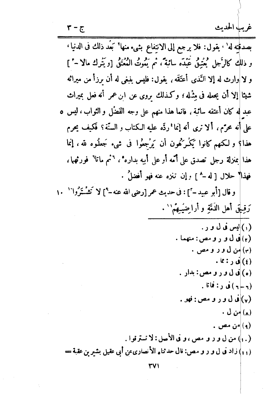 بصدقتِه لَهُ يَقُول: فَلَا يرجع إِلَى الانتِفاع بِشَيْء مِنْهَا بَعد ذَلِك فِي الدُّنْيَا وَذَلِكَ كالرَّجل يُعْتِقُ عَبْدَه سائبةً ثمَّ يَمُوتُ المُعْتَقُ [ويَتْرك مَالا -] وَلَا وَارِث لَهُ إِلَّا الَّذي أعتَقَه يَقُول: فَلَيْسَ يَنْبَغِي لَهُ أَن يرزأ من مِيرَاثه شَيْئا إِلَّا أَن يَجعله فِي مِثْله وَكَذَلِكَ يرْوى عَن ابْن عمر أَنه فعل بميراث عبدٍ لَهُ كَانَ أعْتقهُ سائبة فَإِنَّمَا هَذَا مِنْهُم على وَجه الفَضْل وَالثَّوَاب لَيْسَ على أَنه محرّم أَلا ترى أَنه إِنَّمَا ردَّه عَلَيْهِ الْكتاب والسنّة فَكيف يحرم هَذَا وَلَكنهُمْ كَانُوا يَكْرَهُون أَن يَرْجِعُوا فِي شَيْء جَعلُوه لله إِنَّمَا هَذَا بِمَنْزِلَة رجل تصدق على أمّه أَو على أَبِيه بداره ثمَّ مَاتَا فورثهما فَهَذَا حَلَال [لَهُ -] وَإِن تنزه عَنهُ فَهُوَ أفضلُ. وَقَالَ [أَبُو عبيد -] : فِي حَدِيث عمر [رَضِي الله عَنهُ -] لَا تَشْتَرُوا رَقِيق أهل الذِّمَّة وأراضيهم.