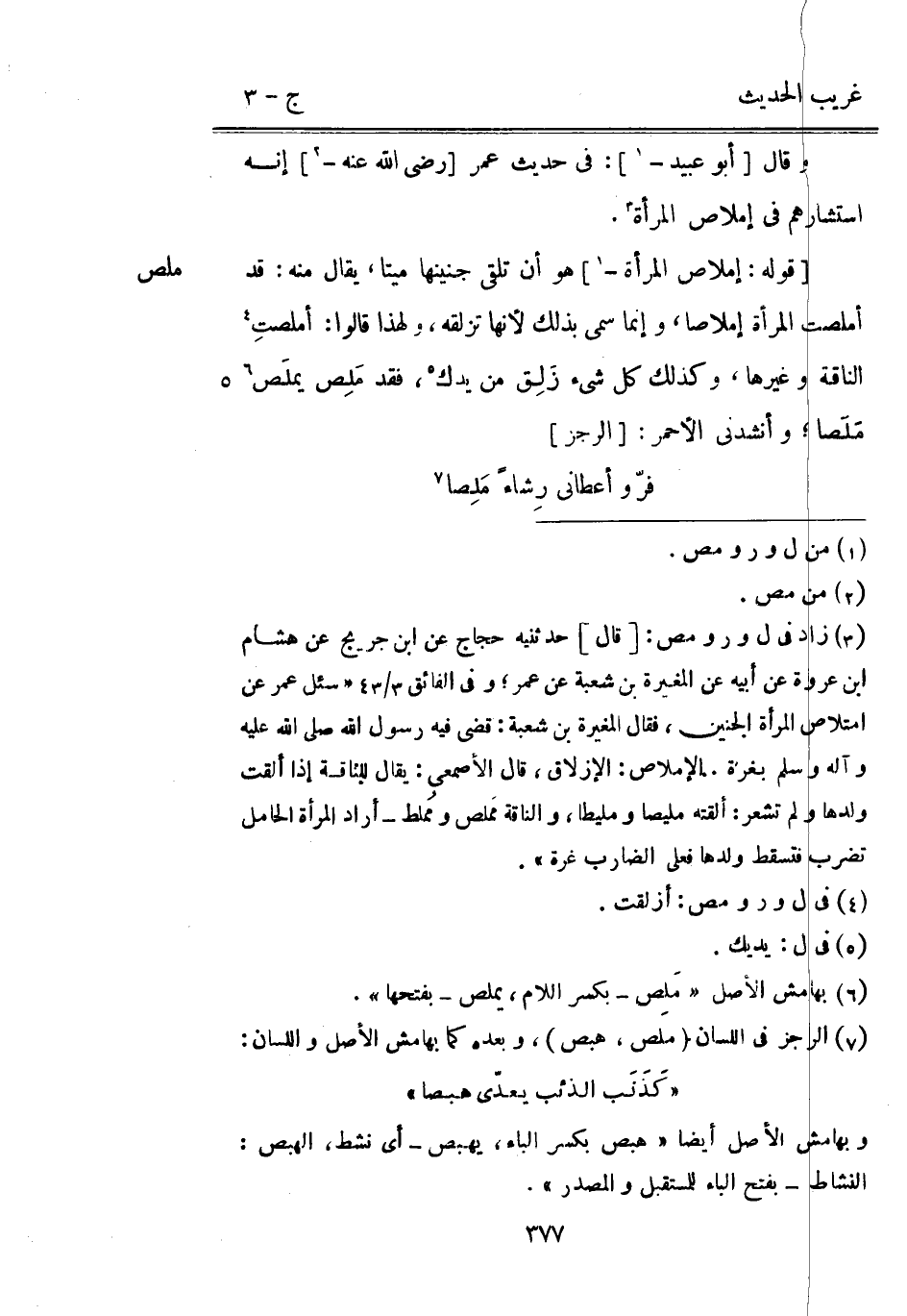 ملص وَقَالَ [أَبُو عبيد -] : فِي حَدِيث عُمَر [رَضِيَ الله عَنْهُ -] إِنَّه استشارهم فِي إملاص الْمَرْأَة. [قَوْله: إملاص الْمَرْأَة -] هُوَ أَن تلقي جَنِينهَا مَيتا يُقَال مِنْهُ: قد أمصلت الْمَرْأَة إملاصا وَإِنَّمَا سمي بذلك لِأَنَّهَا تزلقه وَلِهَذَا قَالُوا: أملصتِ النَّاقة وَغَيرهَا وَكَذَلِكَ كل شَيْء زَلِق من يدك فقد مَلِص يملَص مَلَصا وأنشدني الْأَحْمَر: [الرجز]