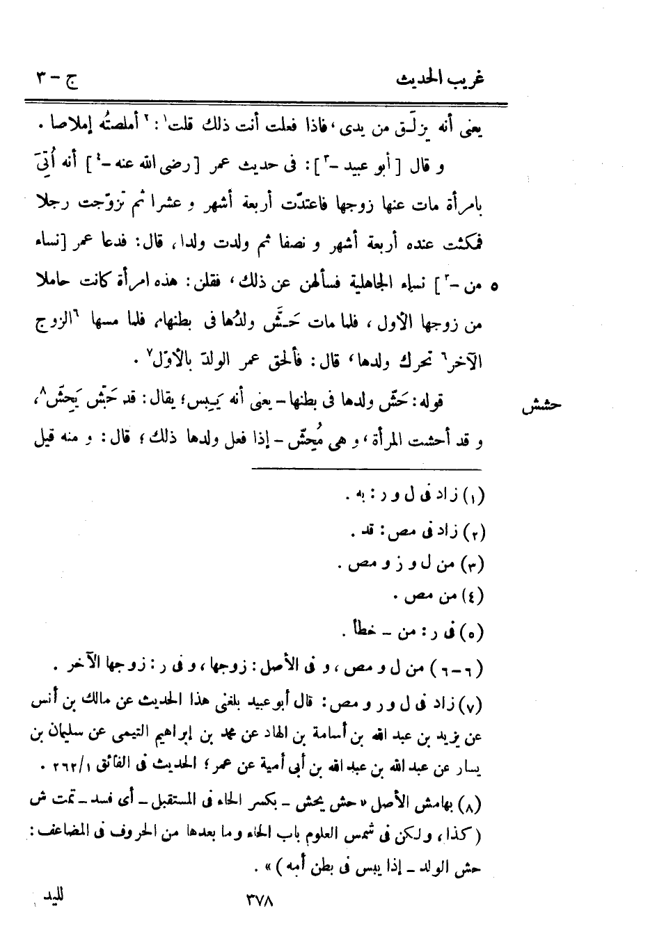 حشش وَقَالَ [أَبُو عبيد -] : فِي حَدِيث عمر [رَضِي الله عَنهُ -] أَنه أُتِيَ بِامْرَأَة مَاتَ عَنْهَا زَوجهَا فاعتدّت أَرْبَعَة أشهر وَعشرا ثمَّ تزوجّت رجلا فَمَكثت عِنْده أَرْبَعَة أشهر وَنصفا ثمَّ ولدت ولدا قَالَ: فَدَعَا عمر [نسَاء من -] نسَاء الْجَاهِلِيَّة فسألهن عَن ذَلِك فَقُلْنَ: هَذِه امْرَأَة كَانَت حَامِلا من زَوجهَا الأول فَمَا مَاتَ حَشَّ ولدُها فِي بَطنهَا فَلَمَّا مَسهَا الزَّوْج الآخر تحرّك وَلَدهَا قَالَ: فَألْحق عمر الولدَ بالأوّل. قَوْله: حَشَّ وَلَدهَا فِي بَطنهَا يَعْنِي أَنه يَبِس يُقَال: قد حَشّ يَحِشَ وَقد أحشت الْمَرْأَة وَهِي مُحِشّ إِذا فعل وَلَدهَا ذَلِك قَالَ: وَمِنْه قيل