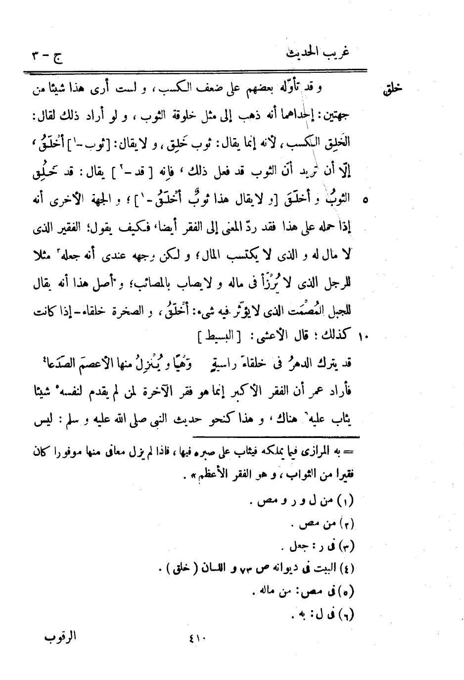 وَقد تأوّله بَعضهم على ضعف الْكسْب وَلست أرى هَذَا شَيْئا من جِهَتَيْنِ إِحْدَاهمَا أَنه ذهب إِلَى مثل خلوقة الثَّوْب وَلَو أَرَادَ ذَلِك لقَالَ: الخلِق الْكسْب لِأَنَّهُ إِنَّمَا يُقَال: ثوب خَلِق وَلَا يُقَال: [ثوب -] أخْلَقُ إلاّ أَن تُرِيدُ أنّ الثَّوْب قد فعل ذَلِك فإِنه [قد -] يُقَال: قد خَلُق (خَلِق) الثوبُ وأخلَق [وَلَا يُقَال هَذَا ثوبٌ أخْلَقُ -] والجهة الْأُخْرَى أَنه إِذا حمله على هَذَا فقد ردّ الْمَعْنى إِلَى الْفقر أَيْضا فَكيف يَقُول الْفَقِير الَّذِي لَا مَال لَهُ وَالَّذِي لَا يكْتَسب المَال وَلَكِن وَجهه عِنْدِي أَنه جعله مثلا للرجل الَّذِي لَا يُرْزَأ فِي مَاله وَلَا يصاب بالمصائب وأصل هَذَا أَنه يُقَال للجبل المُصْمَت الَّذِي لَا يؤثّر فِيهِ شَيْء: أخْلَقُ والصخرة خلقاء إِذا كَانَت كَذَلِك قَالَ الْأَعْشَى: [الْبَسِيط]