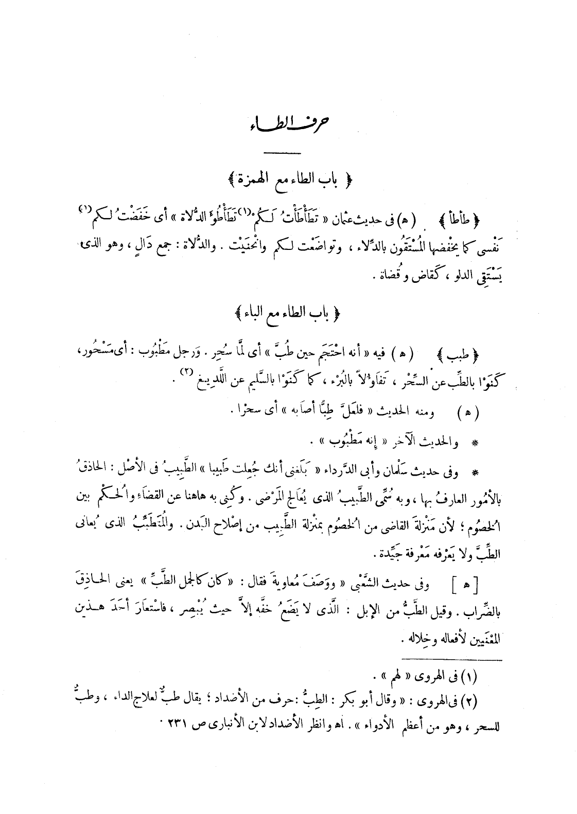 (3) في الهروي: «وقال أبو بكر: الطِبُّ: حرف من الأضداد، يقال طبٌّ لعلاج الداء، وطبٌّ للسحر، وهو من أعظم الأدواء» . اهـ وانظر الأضداد لابن الأنباري ص 231.