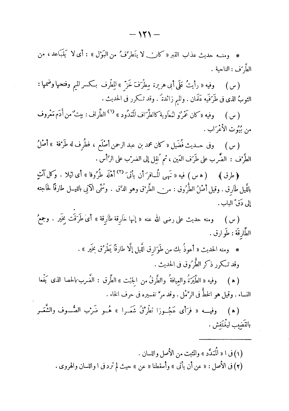 وَمِنْهُ حَدِيثُ عَذَابِ الْقَبْرِ «كَانَ لَا يَتَطَرَّفُ مِنَ البَوْل» : أَيْ لَا يَتَبَاعد، مِنَ الطَّرَف: النَّاحِيَةِ.