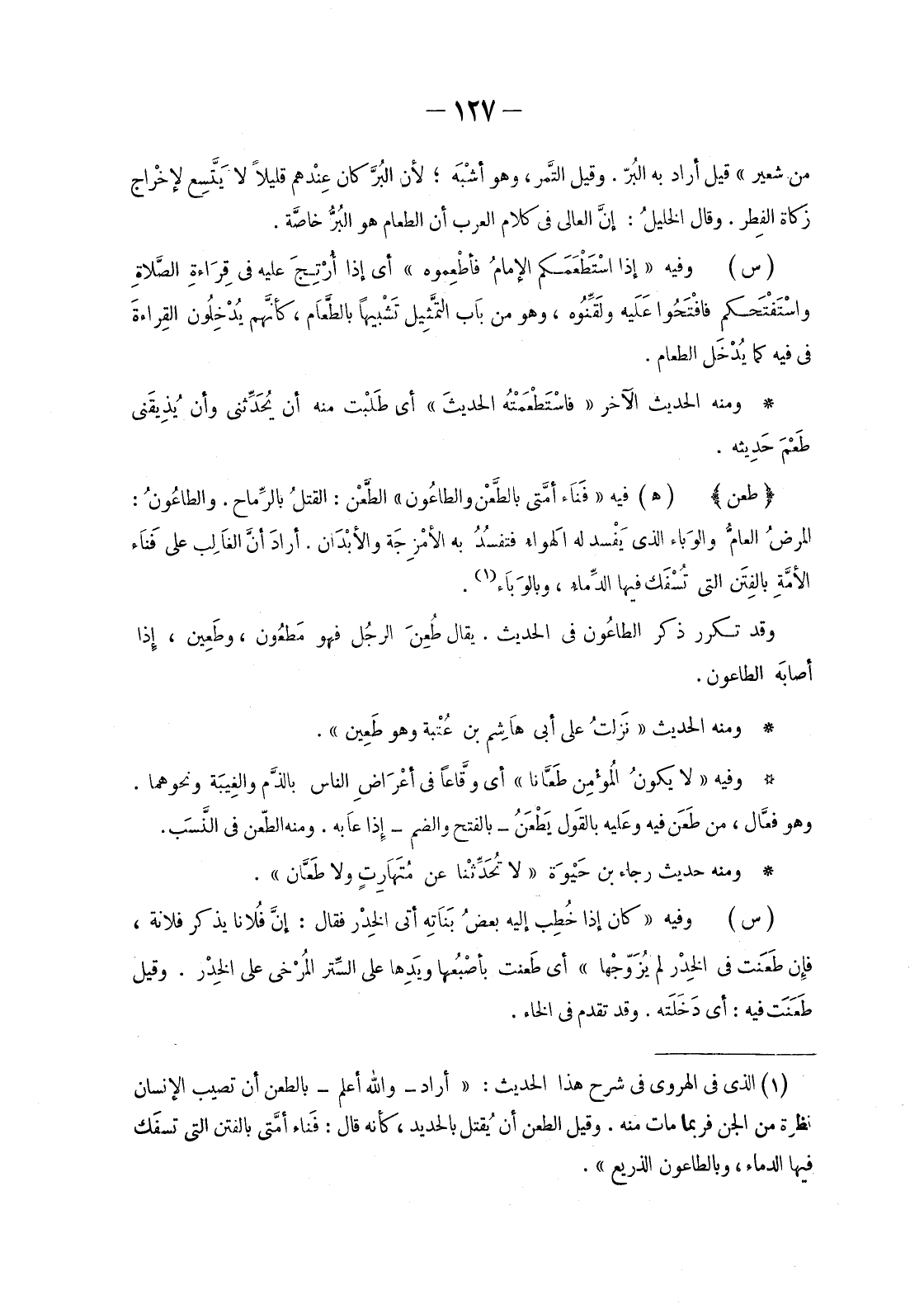 (1) الذي في الهروي في شرح هذا الحديث: «أراد- والله أعلم- بالطعن أن تصيب الإنسان نظرة من الجن فربما مات منه. وقيل الطعن أن يُقتل بالحديد، كأنه قال: فَناء أمَّتي بالفتن التي تسفَك فيها الدماء، وبالطاعون الذريع» .