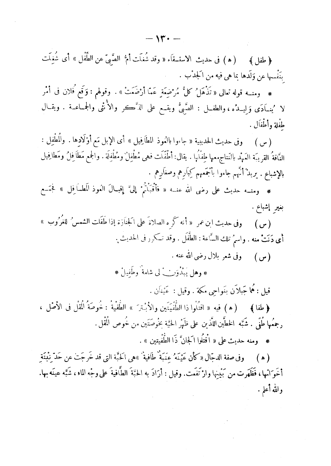 النَّاقةُ القريبَة العَهْد بِالنِّتَاجِ مَعَهَا طِفْلُهَا. يُقَالُ: أَطْفَلَتْ فَهِيَ مُطْفِل. ومُطْفِلَة. وَالْجَمْعُ مَطَافِل ومَطَافِيل بِالْإِشْبَاعِ. يريدُ أنَّهم جَاءُوا بأجمْعَهم كِبَارِهم وصغَارِهم.