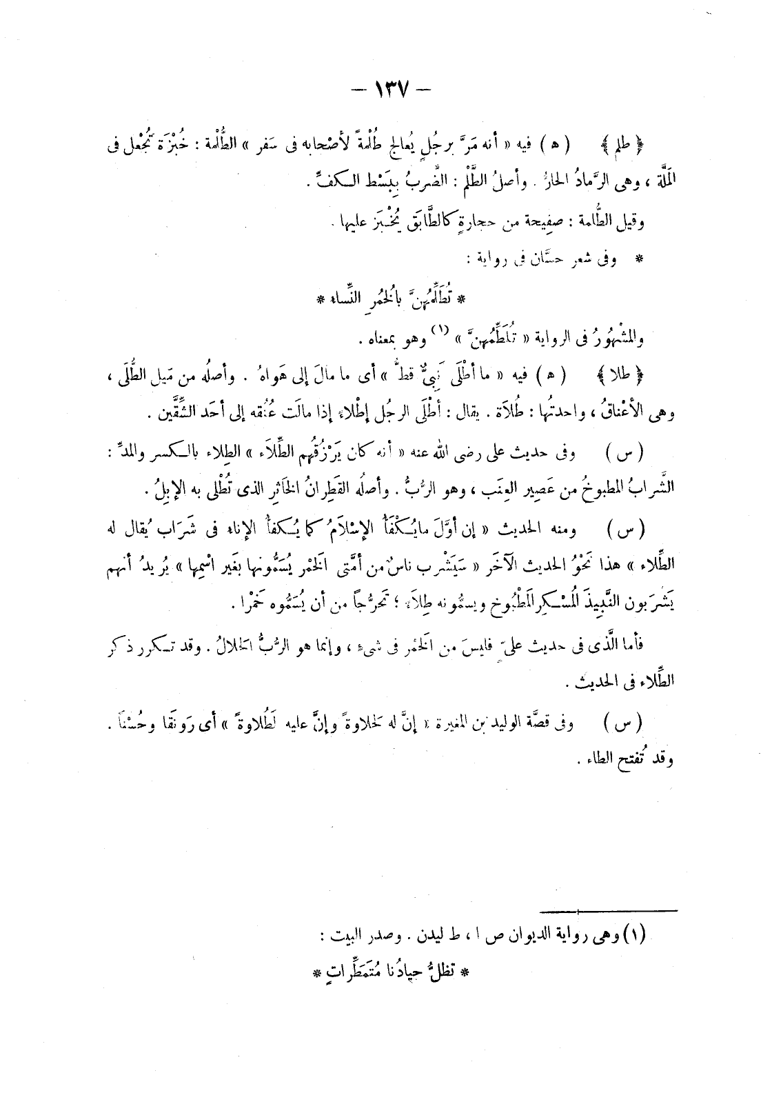 فَأَمَّا الَّذِي فِي حَدِيثِ عليٍّ فليسَ مِنَ الخَمْر فِي شيءٍ، وَإِنَّمَا هُوَ الرُّبُّ الحَلالُ. وَقَدْ تَكَرَّرَ ذِكْرُ الطِّلَاء فِي الْحَدِيثِ.