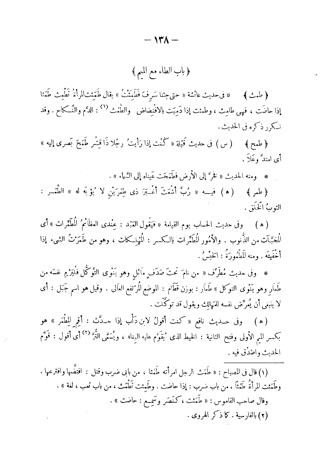 (1) قال في المصباح: «طَمَث الرجل امرأته طَمْثا، من بابي ضرب وقتل: افتَّضها وافترعها. وطَمَثت المرأةُ طَمْثاً، من باب ضرب: إذا حاضت. وطَمِثت تَطْمَث، من باب تعب، لغة» . وقال صاحب القاموس: «طَمَثت، كنَصَر وسَمِع: حاضت» .