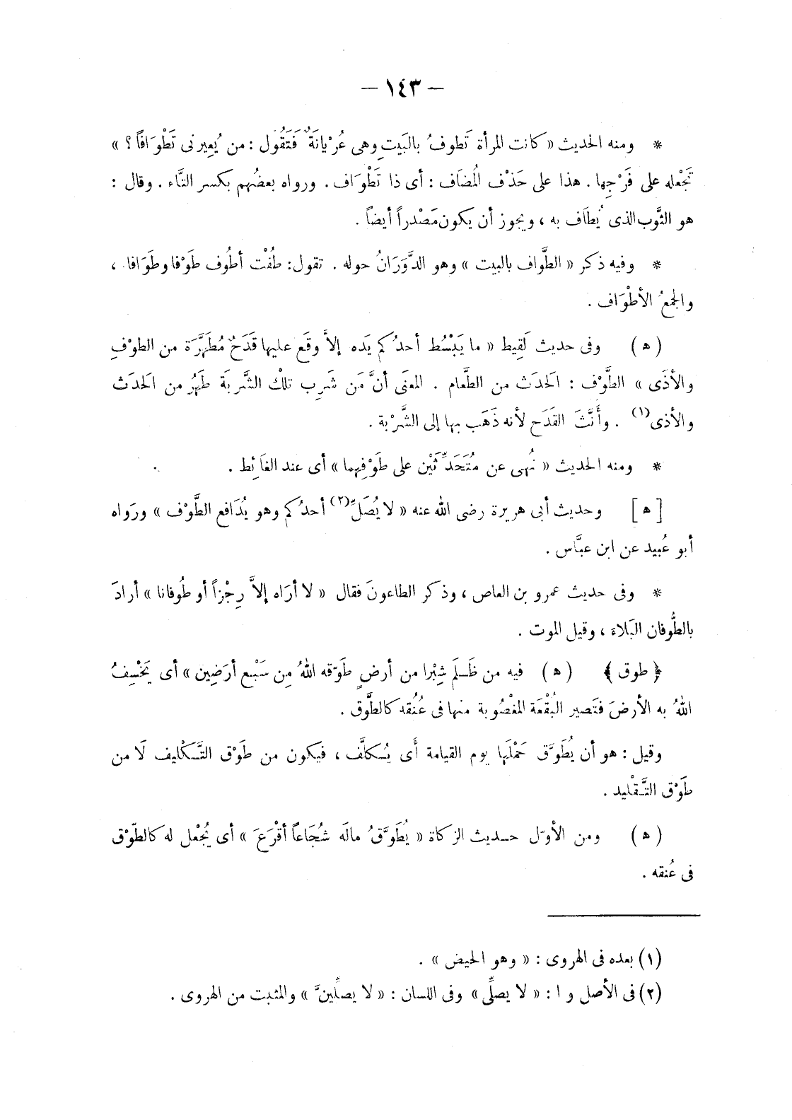 وَفِيهِ ذِكْرُ «الطَّوَاف بِالْبَيْتِ» وَهُوَ الدَّوَرَانُ حَوْلَهُ. تَقُولُ: طُفْتُ أَطُوفُ طَوْفا وطَوَافا، والجمعُ الأَطْوَاف.