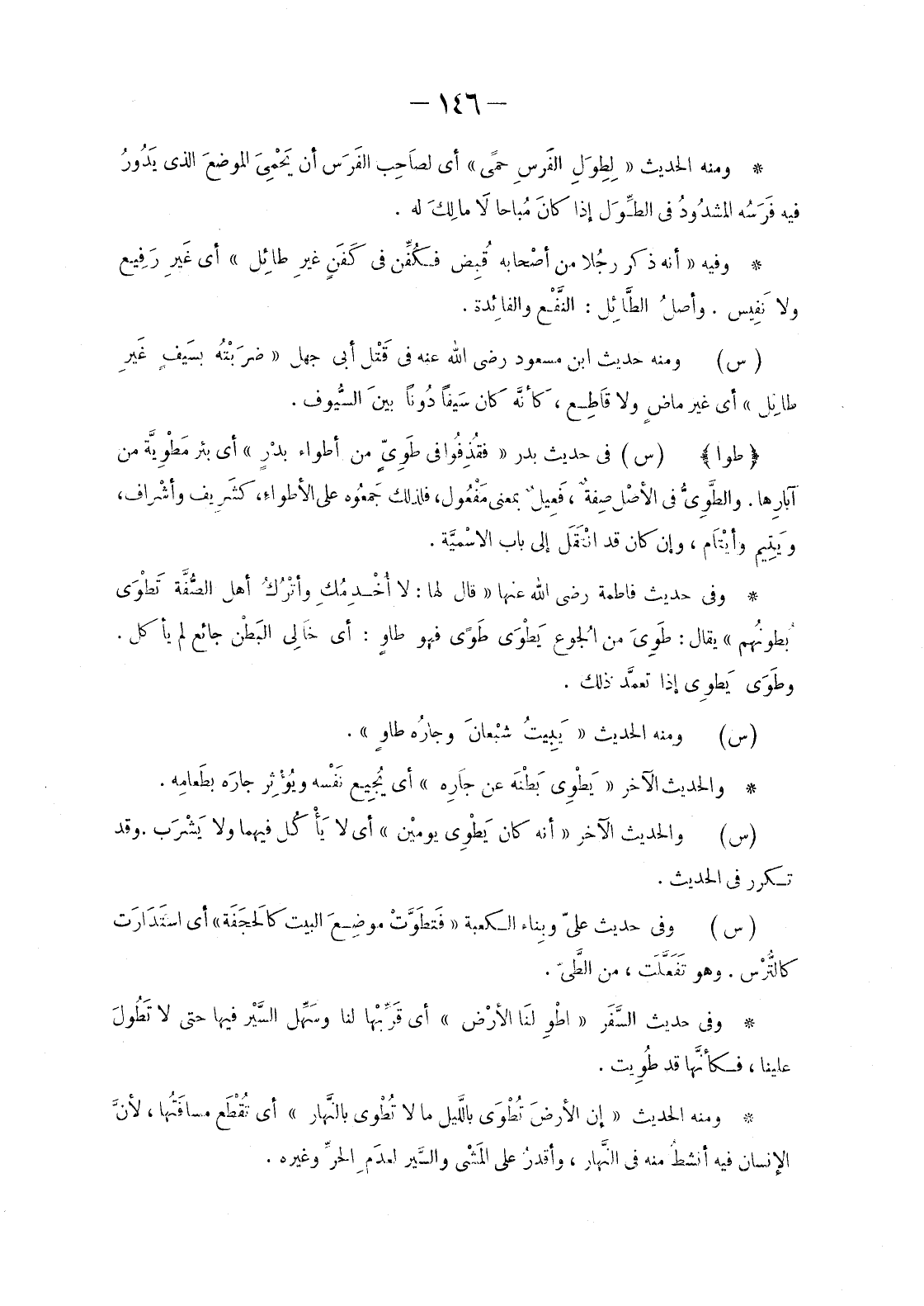 وَمِنْهُ الْحَدِيثُ «إِنَّ الأرضَ تُطْوَى باللَّيل مَا لَا تُطْوَى بالنَّهار» أَيْ تُقْطَع مسافَتُها، لأنَّ الْإِنْسَانَ فِيهِ أنشطُ مِنْهُ فِي النَّهار، وأقدرُ عَلَى المَشْي والسَّير لعدَمِِ الحرِّ وَغَيْرِهِ.