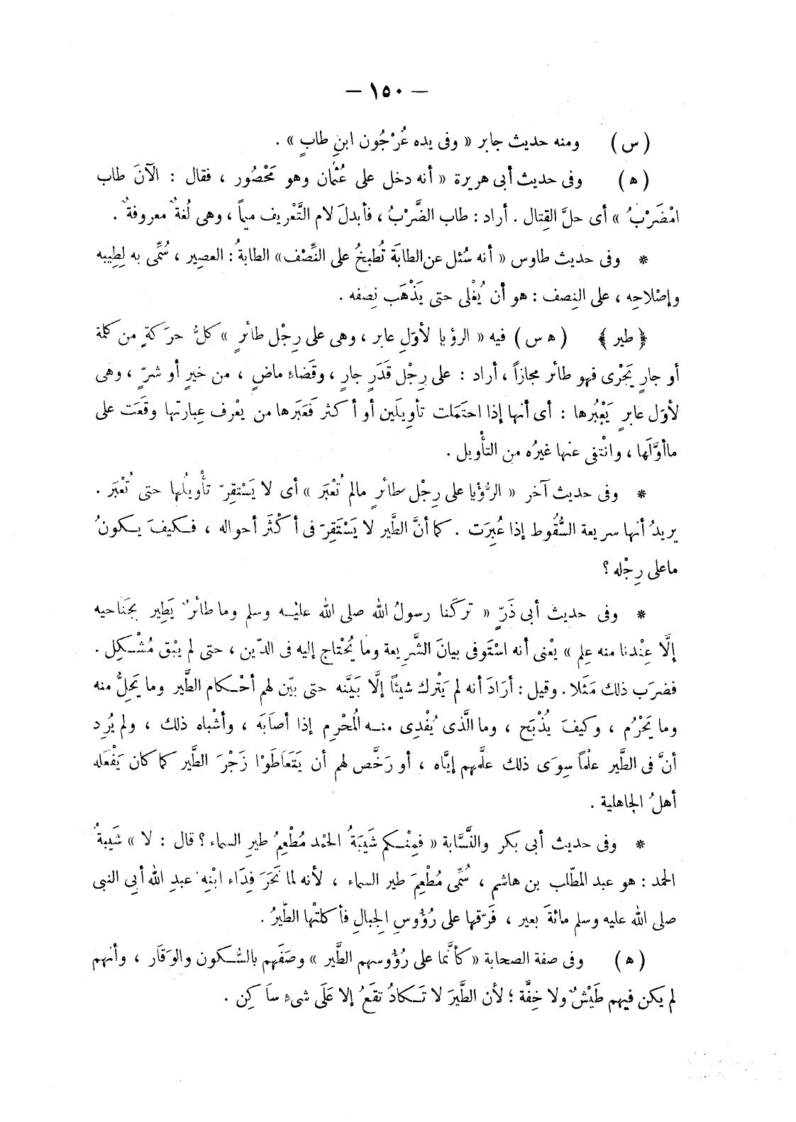 وَفِي حَدِيثِ أَبِي ذَرٍّ «تركَنا رسولُ اللَّهِ صَلَّى اللَّهُ عَلَيْهِ وَسَلَّمَ وَمَا طَائِر يَطِير بجَنَاحيه إلاَّ عِنْدنا مِنْهُ عِلم» يعْني أَنَّهُ اسْتَوفى بيانَ الشَّرِيعة وَمَا يُحْتاج إِلَيْهِ فِي الدِّينِ، حَتَّى لَمْ يبْق مُشْكِل.