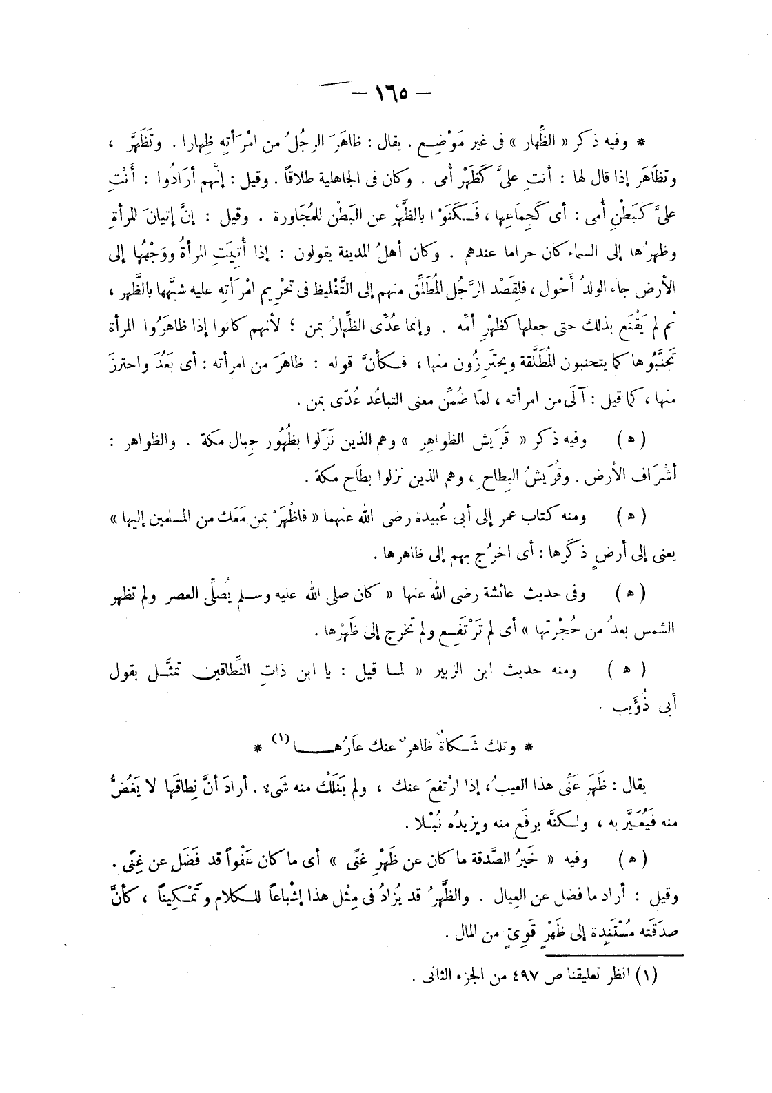 وَفِيهِ ذِكْرُ «الظِّهَار» فِي غَيْرِ مَوْضِع. يُقَالُ: ظَاهَرَ الرجُلُ من امْرَأتِه ظِهَاراً. وتَظَهَّرَ، وتَظَاهَرَ إِذَا قَالَ لَهَا: أنتِ عَلَيَّ كظَهْرِ أُمي. وَكَانَ فِي الْجَاهِلِيَّةِ طَلَاقًا. وَقِيلَ: أنَّهم أرَادُوا: أنْتِ عليَّ كبَطْنِ أُمي: أَيْ كَجِمَاعهِا، فَكَنوْا بالظَّهْر عَنِ البَطْن للمُجَاورة. وَقِيلَ: إنَّ إتيانَ المرأةِ وظَهْرُها إِلَى السَّمَاءِ كَانَ حَرَامًا عِنْدَهُمْ. وَكَانَ أهلُ الْمَدِينَةِ يَقُولُونَ: إِذَا أُتِيَتِ المرأةُ وَوَجْهُهَا إِلَى الْأَرْضِ جَاءَ الولدُ أحْول، فلِقَصْد الرَّجُل المُطَلَّق مِنْهُمْ إِلَى التَّغْليظ فِي تحْرِيم امْرَأتِه عَلَيْهِ شبَّهها بالظَّهْر، ثُمَّ لَمْ يَقْنَع بِذَلِكَ حَتَّى جَعَلَهَا كظَهْرِ أمِّه. وَإِنَّمَا عُدِّي الظِّهَار بِمِنْ، لِأَنَّهُمْ كَانُوا إِذَا ظَاهَرُوا الْمَرْأَةَ تَجنَّبُوها كَمَا يَتَجَنَّبُونَ المُطَلَّقة ويحتَرِزُون مِنْهَا، فكأنَّ قَوْلَهُ: ظَاهَرَ مِنَ امْرَأَتِهِ: أَيْ بَعُدَ واحترزَ مِنْهَا، كَمَا قِيلَ: آلَى مِنَ امْرَأَتِهِ، لمَّا ضُمِّن مَعْنَى التباعُد عُدّي بِمِنْ.
