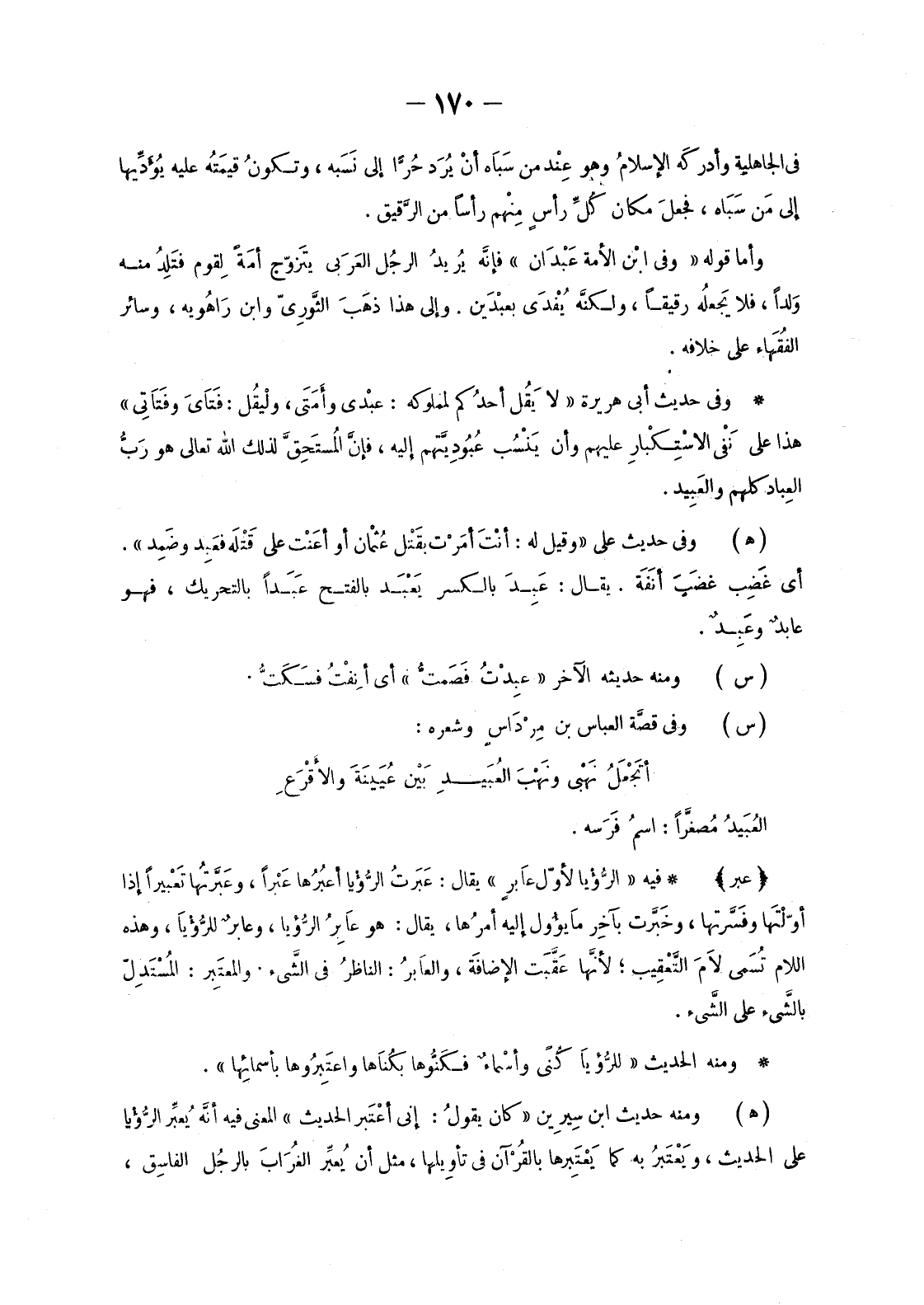 وَفِي حَدِيثِ أَبِي هُرَيْرَةَ «لَا يَقُل أحدُكم لِمَمْلُوكِهِ: عَبْدِي وأَمَتَي، ولْيقُل: فَتَايَ وفَتَاتِي» هَذَا عَلَى نَفْي الاْسِتْكبارِ عَلَيْهِمْ وَأَنْ يَنْسُب عُبُودِيَّتَهُم إِلَيْهِ، فإنَّ المُسْتَحِقَّ لِذَلِكَ اللَّهُ تَعَالَى هُوَ رَبُّ العِبَاد كُلِّهِمْ والعَبِيد.