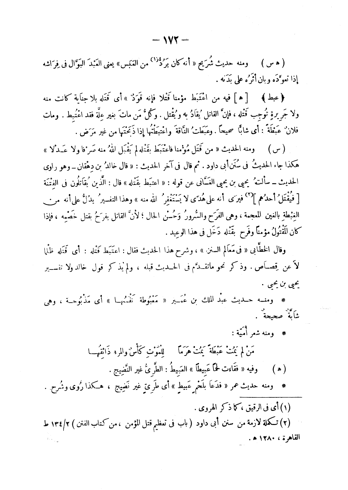 (2) تكملة لازمة من سنن أبى داود (باب في تعظيم قتل المؤمن، من كتاب الفتن) 2/ 134 ط القاهرة، 1280 هـ.
