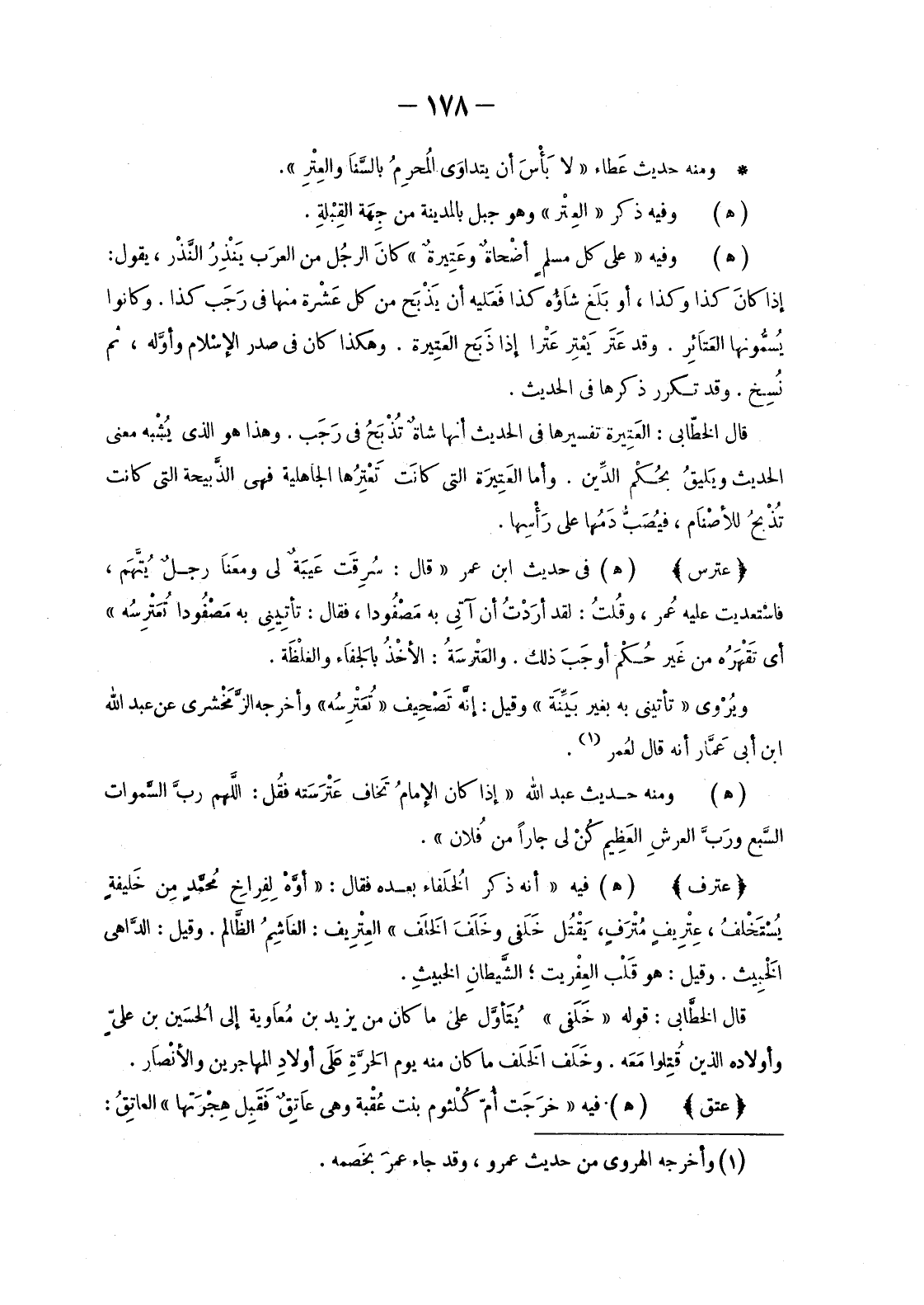 قَالَ الْخَطَّابِيُّ: العَتِيرَة تَفْسِيرُهَا فِي الْحَدِيثِ أَنَّهَا شاةٌ تُذْبَحُ فِي رَجَب. وَهَذَا هُوَ الَّذِي يُشْبه مَعْنَى الْحَدِيثِ ويَليقُ بحُكْم الدَّين. وَأَمَّا العَتِيرَة الَّتِي كَانَتْ تَعْتِرُهَا الْجَاهِلِيَّةُ فَهِيَ الذَّبيحة الَّتِي كَانَتْ تُذْبحُ للأصْنَام، فيُصَبُّ دَمُها عَلَى رَأْسِها.