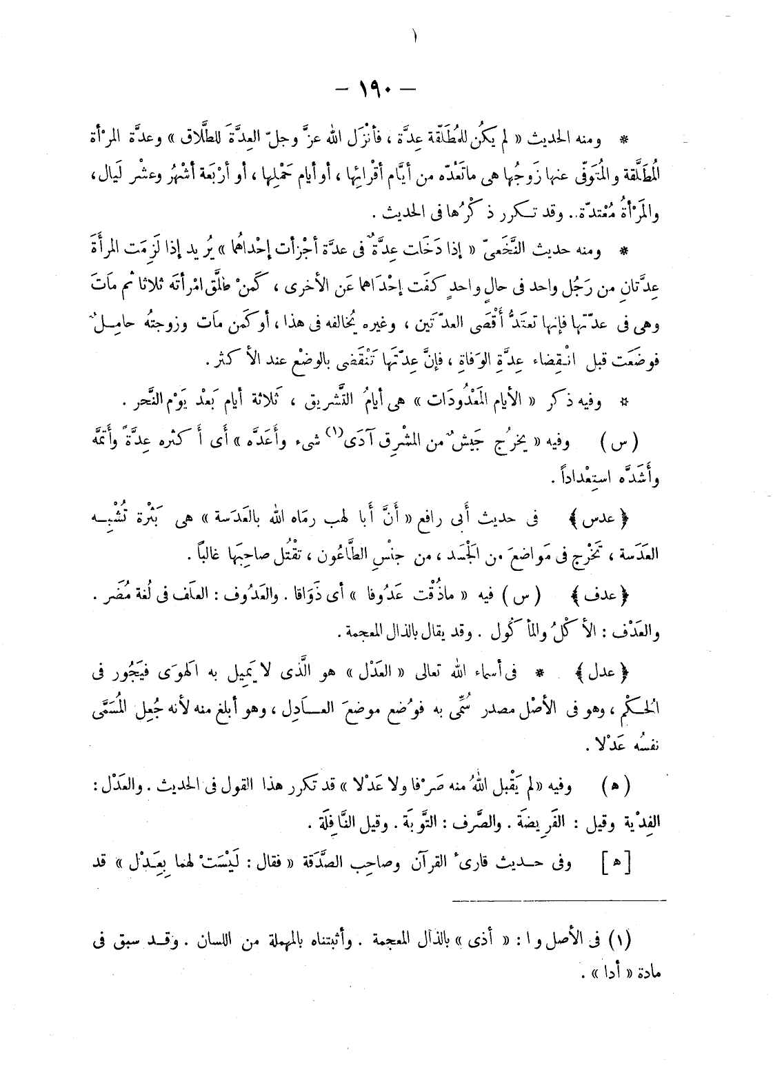 وَمِنْهُ الْحَدِيثُ «لَمْ يكُن للمُطَلّقة عِدَّة، فأنْزَل اللَّهُ عزَّ وَجَلَّ العِدَّة للطَّلاق» وعِدَّة المرْأة المُطَلَّقة والمُتَوفّى عَنْهَا زَوجُها هِيَ مَا تَعُدُّه مِنْ أيَّام أقْرائِها، أَوْ أَيَّامِ حَمْلِها، أَوْ أرْبَعة أشْهُر وعشْر لَيال، والمَرْأةُ مُعْتَدَّة. وَقَدْ تَكَرَّرَ ذكْرُها فِي الْحَدِيثِ.