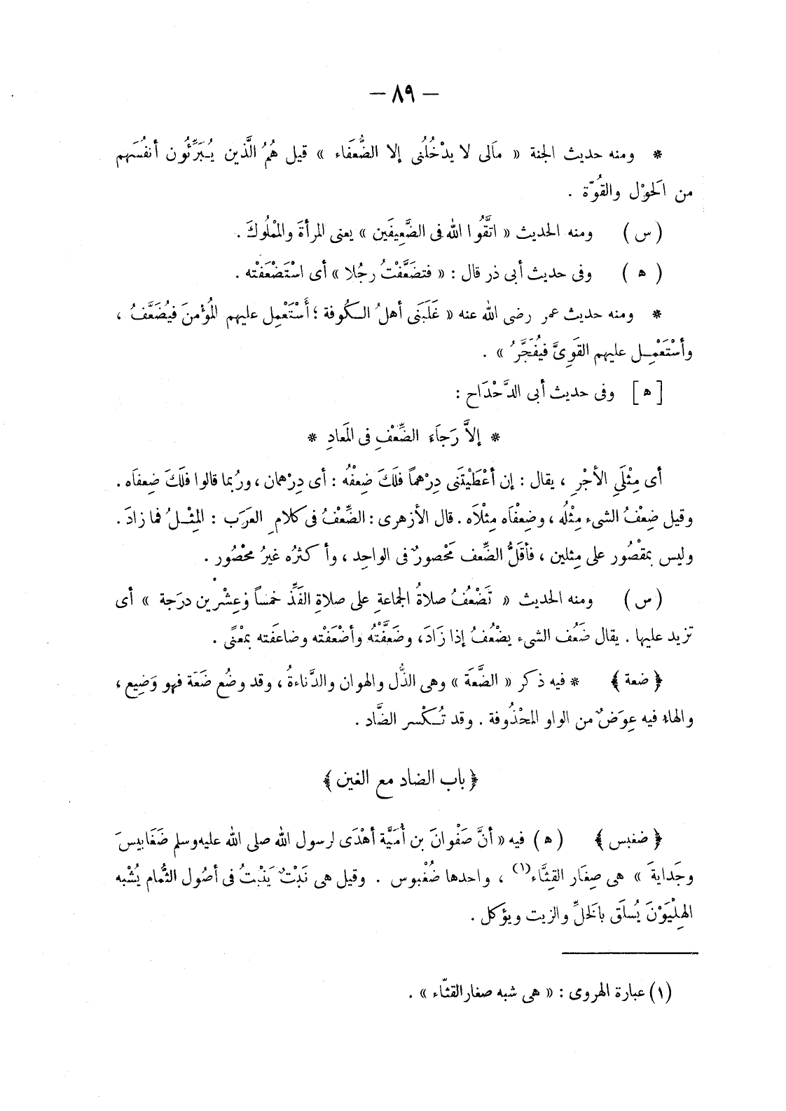 فِيهِ ذِكْرُ «الضَّعَة» وَهِيَ الذُّل وَالْهَوَانُ والدَّناءةُ، وَقَدْ وَضُعَ ضَعَةً فَهُوَ وَضِيع، والهاءُ فِيهِ عِوَضٌ مِنَ الْوَاوِ المحْذُوفة. وَقَدْ تُكْسر الضَّاد.