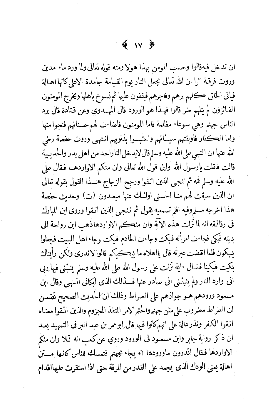 لا يدخل النار أحد من أهل بدر والحديبية قالت فقلت يا رسول الله وأين قول الله تعالى وإن منكم إلا واردها فقال صلى الله عليه و سلم فمه ثم ننجي الذين اتقوا ورجح الزجاج هذا القول بقوله تعالى إن الذين سبقت لهم منا الحسنى أولئك عنها مبعدون ت وحديث حفصة هذا أخرجه مسلم وفيه