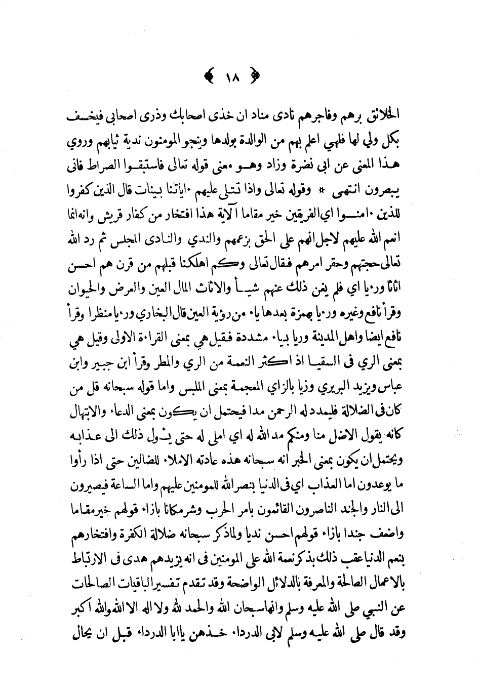 وقوله تعالى وإذا تتلى عليهم آياتنا بينات قال الذين كفروا للذين آمنوا أي الفريقين خير مقاما الآية هذا افتخار من كفار قريش وأنه أنما أنعم الله عليهم لأجل أنهم على الحق بزعمهم والندي والنادي المجلس ثم رد الله تعالى حجتهم وحقر أمرهم فقال تعالى وكم أهلكنا قبلهم من قرن هم أحسن أثاثا ورءيا أي فلم يغن ذلك عنهم شيئا والأثاث المال العين والعرض والحيوان وقرأ نافع وغيره ورءيا بهمزة بعدها ياء من رؤية العين قال البخاري ورءيا منظرا وقرأ نافع أيضا وأهل المدينة وريا بياء مشددة فقيل هي بمعنى القراءة الأولى وقيل هي بمعنى الري في السقيا إذا كثر النعمة من الري والمطر وقرأ ابن جبير وابن عباس ويزيد البريري وزيا بالزاي المعجمة بمعنى الملبس وأما قوله سبحانه قل من كان في الضلالة فليمدد له الرحمن مدا فيحتمل أن يكون بمعنى الدعاء والابتهال كأنه يقول الأضل منا ومنكم مد الله له أي أملي له حتى يؤول ذلك إلى عذابه ويحتمل أن يكون بمعنى الخبر أنه سبحانه هذه عادته الاملاء للضالين حتى إذا رأوا ما يوعدون أما العذاب أي في الدنيا بنصر الله للمؤمنين عليهم وأما الساعة فيصيرون إلى النار والجند الناصرون القائمون بأمر الحرب وشر مكانا بأزاء قولهم خير مقاما وأضعف جندا بأزاء قولهم أحسن نديا ولما ذكر سبحانه ضلالة الكفرة وافتخارهم بنعم الدنيا عقب ذلك بذكر نعمة الله على المؤمنين في أنه يزيدهم هدى في الارتباط بالأعمال الصالحة والمعرفة بالدلائل الواضحة وقد تقدم تفسير الباقيات الصالحات عن النبي صلى الله عليه و سلم وأنها سبحان الله والحمد لله ولا اله إلا الله والله اكبر وقد قال صلى الله عليه و سلم لأبي الدرداء خذهن يا أبا الدرداء قبل أن يحال