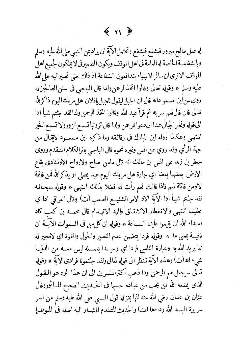 له عمل صالح مبرور فيشفع فيشفع وتحتمل الآية أن يراد بمن النبي صلى الله عليه و سلم وبالشفاعة الخاصة له العامة في أهل الموقف ويكون الضمير في لا يملكون لجميع أهل الموقف ألا ترى أن سائر الأنبياء يتدافعون الشفاعة إذ ذاك حتى تصير إليه صلى الله عليه و سلم وقوله تعالى وقالوا اتخذ الرحمن ولدا قال الباجي في سنن الصالحين له روي عن ابن مسعود أنه قال أن الجبل ليقول للجبل يا فلان هل مر بك اليوم ذاكر لله تعالى فإن قال نعم سر به ثم قرأ عبد الله وقالوا اتخذ الرحمن ولدا لقد جئتم شيئا إدا إلى قوله وتخر الجبال هدا أن دعوا للرحمن ولدا قال أترونها تسمع الزور ولا تسمع الخير انتهى وهكذا رواه ابن المبارك في رقائقه وما ذكره ابن مسعود لا يقال من جهة الرأي وقد روي عن أنس وغيره نحوه قال الباجي بأثر الكلام المتقدم وروي جعفر بن زيد عن أنس بن مالك أنه قال ما من صباح ولا رواح إلا وتنادى بقاع الأرض بعضها بعضا أي جاره هل مر بك اليوم عبد يصلى أو يذكر الله فمن قائله لا ومن قائله نعم فإذا قالت نعم رأت لها فضلا بذلك انتهى