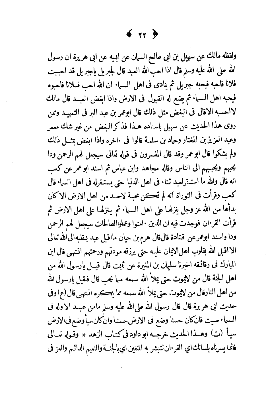ولفظه مالك عن سهيل بن أبي صالح السمان عن أبيه عن أبي هريرة أن رسول الله صلى الله عليه و سلم قال إذا أحب الله العبد قال لجبريل يا جبريل قد أحببت فلانا فأحبه فيحبه جبريل ثم ينادى في أهل السماء أن الله أحب فلانا فأحبوه فيحبه أهل السماء ثم يضع له القبول في الأرض وإذا أبغض العبد قال مالك لا أحسبه إلا قال في البغض مثل ذلك قال أبو عمر بن عبد البر في التمهيد وممن روى هذا الحديث عن سهيل بإسناده هذا فذكر البغض من غير شك معمر وعبد العزيز بن المختار وحماد بن سلمة قالوا في ءاخره وإذا أبغض بمثل ذلك ولم يشكوا قال أبو عمر وقد قال المفسرون في قوله تعالى سيجعل لهم الرحمن ودا يحبهم ويحببهم إلى الناس وقاله مجاهد وابن عباس ثم أسند أبو عمر عن كعب أنه قال والله ما اتسقر لعبد ثناء في أهل الدنيا حتى يستقر له في أهل السماء قال كعب وقرأت في التوراة أنه لم تكن محبة لأحد من أهل الأرض إلا كان بدأها من الله عز و جل ينزلها على أهل السماء ثم ينزلها على أهل الأرض ثم قرأت القرءان فوجدت فيه أن الذين ءامنوا وعملوا الصالحات سيجعل لهم الرحمن ودا وأسند أبو عمر عن قتادة قال قال هرم بن حيان ما أقبل عبد بقلبه إلى الله تعالى إلا أقبل الله بقلوب أهل الإيمان عليه حتى يرزقه مودتهم ورحمتهم انتهى قال ابن المبارك في رقائقه أخبرنا سلميان بن المغيرة عن ثابت قال قيل يا رسول الله من أهل الجنة قال من لا يموت حتى يملأ الله سمعه مما يحب قال فقيل يا رسول الله من أهل النار قال من لا يموت حتى يملأ الله سمعه مما يكره انتهى قال ع وفي حديث أبي هريرة قال قال رسول الله صلى الله عليه و سلم ما من عبد إلا وله في السماء صيت فإن كان حسنا وضع في الأرض حسنا وإن كان سيئا وضع في الأرض سيئا ت وهذا الحديث خرجه أبو داود في كتاب الزهد وقوله تعالى فإنما يسرناه بلسانك أي القرءان لتبشر به المتقين أي بالجنة والنعيم الدائم والعز في