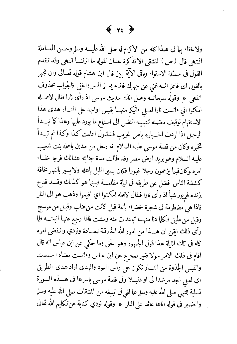 وقوله سبحانه وهل أتاك حديث موسى إذ رأى نارا فقال لأهله امكثوا إني آنست نارا لعلي آتيكم منها بقبس أو أجد على النار هدى هذا الاستفهام توقيف مضمنه تنبيه النفس إلى استماع ما يورد عليها وهذا كما تبدأ الرجل إذا أردت أخباره بأمر غريب فتقول أعلمت كذا وكذا ثم تبدأ تخبره وكان من قصة موسى عليه السلام أنه رحل من مدين بأهله بنت شعيب عليه السلام وهو يريد أرض مصر وقد طالت مدة جنايته هنالك فرجا خفاء أمره وكان فيما يزعمون رجلا غيورا فكان يسير الليل بأهله ولا يسير بالنهار مخافة كشفه الناس فضل عن طريقه في ليلة مظلمة فبينما هو كذلك وقد قدح بزنده فلم يور شيئا إذ رأى نارا فقال لأهله امكثوا أي أقيموا وذهب هو إلى النار فإذا هي مضطرمة في شجرة خضراء يانعة قيل كانت من عناب وقيل من عوسج وقيل من عليق فكلما دنا منها تباعدت منه ومشت فإذا رجع عنها اتبعته فلما رأى ذلك أيقن أن هذا من أمور الله الخارقة للعادة ونودي وانقضى أمره كله في تلك الليلة هذا قول الجمهور وهو الحق وما حكي عن ابن عباس أنه قال أقام في ذلك الأمر حولا فغير صحيح عن ابن عباس وآنست معناه أحسست والقبس الجذوة من النار تكون على رأس العود والهدى أراد هدى الطريق أي لعلي أجد مرشدا لي أو دليلا وفي قصة موسى بأسرها في هذه السورة تسلية للنبي صلى الله عليه و سلم عما لقي في تبليغه من المشقات صلى الله عليه و سلم والضمير في قوله أتاها عائد على النار