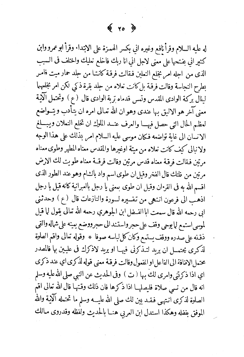 له عليه السلام وقرأ نافع وغيره أني بكسر الهمزة على الابتداء وقرأ أبو عمرو وابن كثير أني بفتحها على معنى لأجل أني أنا ربك فاخلع نعليك واختلف في السبب الذي من أجله أمر بخلع النعلين فقالت فرقة كانتا من جلد حمار ميت فأمر بطرح النجاسة وقالت فرقة بل كانت نعلاه من جلد بقرة ذكي لكن أمر بخلعهما لينال بركة الوادي المقدس وتمس قدماه تربة الوادي قال ع وتحتمل الآية معنى آخر هو الأليق بها عندي وهو أن الله تعالى أمره أن يتأدب ويتواضع لعظم الحال التي حصل فيها والعرف عند الملوك أن تخلع النعلان ويبلغ الإنسان إلى غاية تواضعه فكان موسى عليه السلام أمر بذلك على هذا الوجه ولا نبالي كيف كانت نعلاه من ميتة أو غيرها والمقدس معناه المطهر وطوى معناه مرتين فقالت فرقة معناه قدس مرتين وقالت فرقة معناه طويت لك الأرض مرتين من ظنك قال الفخر وقيل أن طوى اسم واد بالشام وهو عند الطور الذي أقسم الله به في القرءان وقيل أن طوى بمعنى يا رجل بالعبرانية كأنه قيل يا رجل اذهب إلى فرعون انتهى من تفسيره لسورة والنازعات قال ع وحدثني أبي رحمه الله قال سمعت أبا الفضل ابن الجوهري رحمه الله تعالى يقول لما قيل لموسى استمع لما يوحى وقف على حجر واستند إلى حجر ووضع يمينه على شماله وألقى ذقنه على صدره ووقف يستمع وكان كل لباسه صوفا وقوله تعالى وأقم الصلاة لذكري يحتمل أن يريد لتذكرني فيها أو يريد لا ذكر في عليين بها فالمصدر محتمل الإضافة إلى الفاعل أو المفعول وقالت فرقة معنى قوله لذكرة أي عند ذكرى أي إذا ذكرتني وأمري لك بها ت وفي الحديث عن النبي صلى الله عليه و سلم أنه قال من نسي صلاة فليصلها إذا ذكرها فإن ذلك وقتها قال الله تعالى اقم الصلوة لذكرى انتهى فقد بين لك صلى الله عليه و سلم ما تحتمله الآية والله الموفق بفضله وهكذا استدل ابن العربي هنا بالحديث ولفظه وقد روى مالك